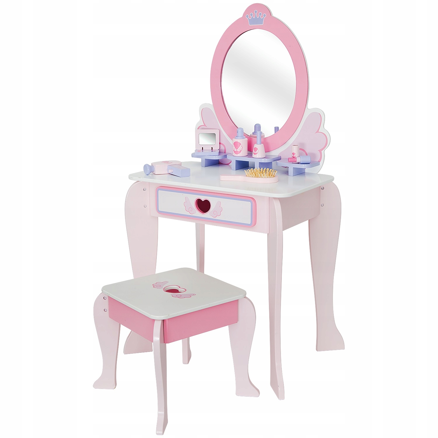 ДЕРЕВ'ЯНИЙ ТУАЛЕТНИЙ СТОЛИК ДЛЯ ДІВЧИНКИ, ДЗЕРКАЛО, ТАБУРЕТ + АКСЕСУАРИ ДЛЯ ВОЛОССЯ