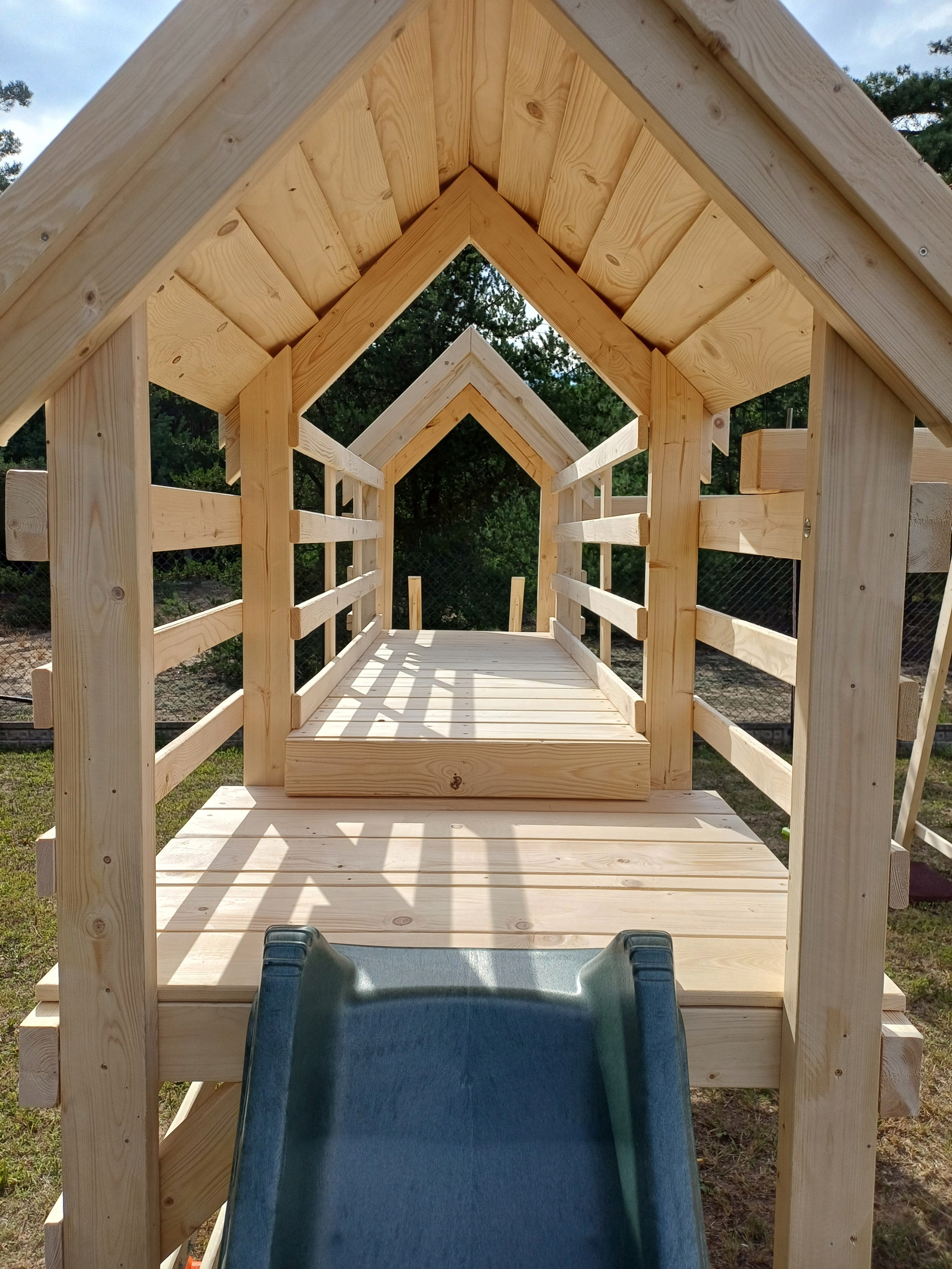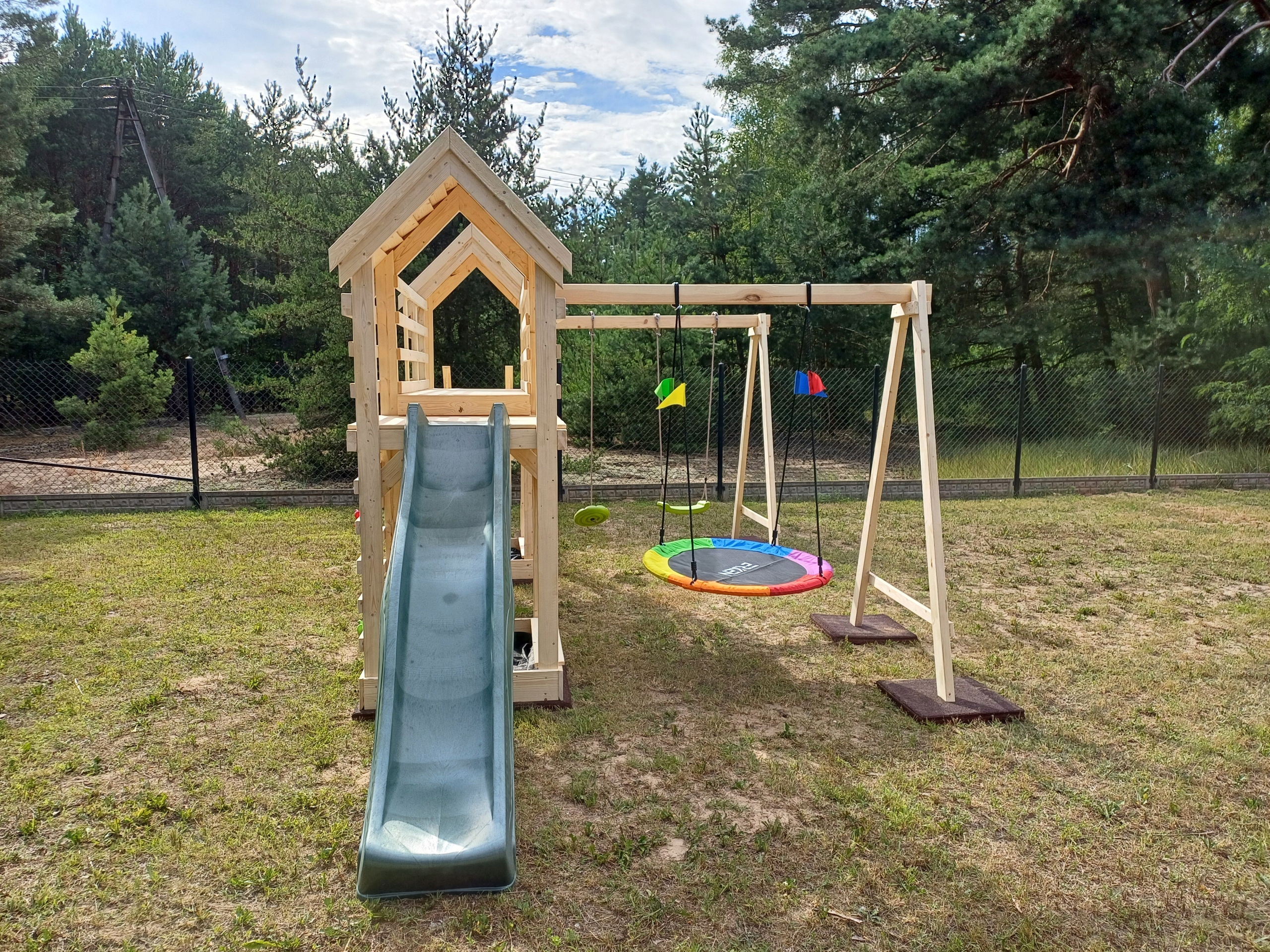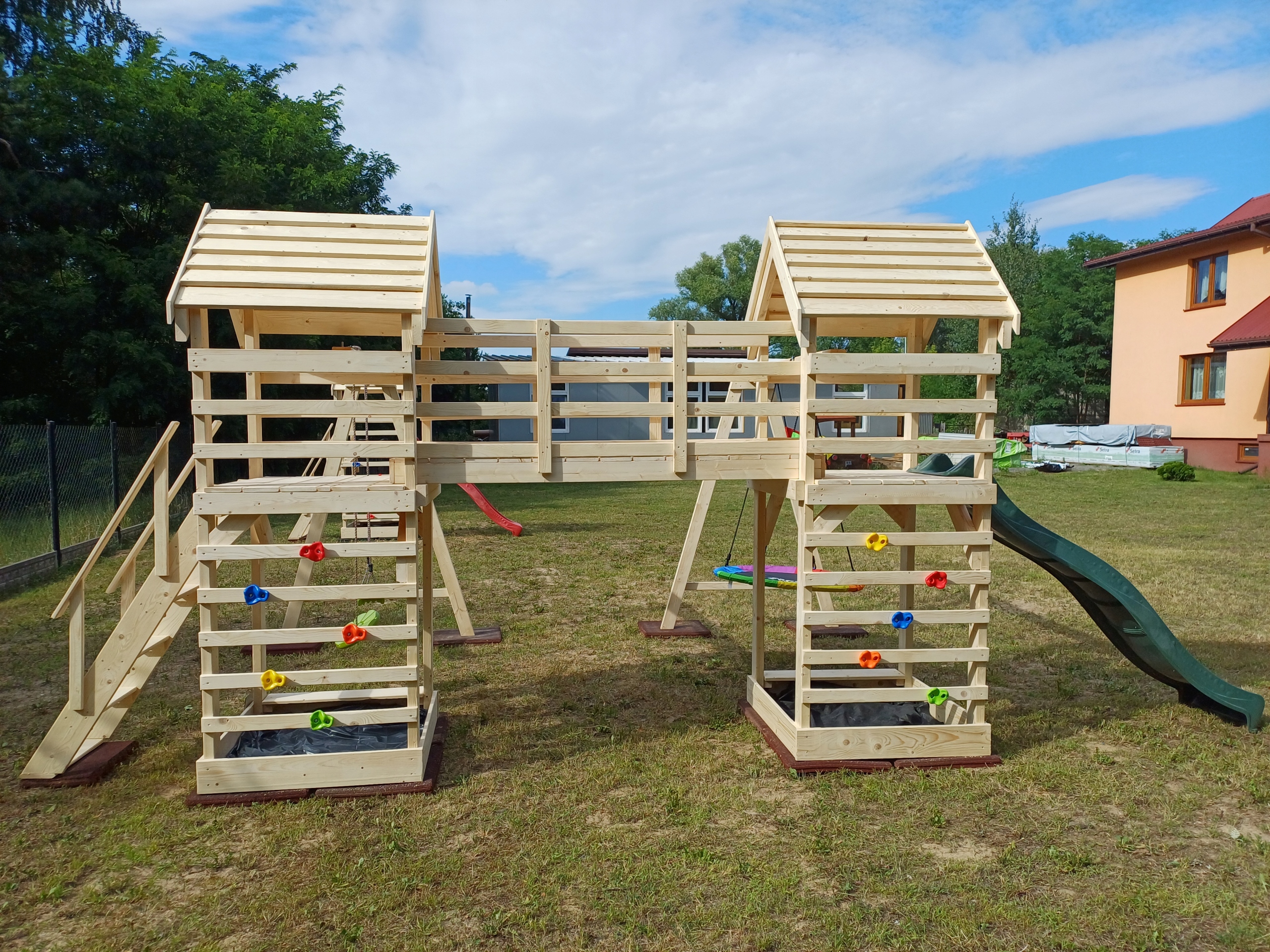 Как вы можете видеть на фотографиях над детской площадкой, есть два места (места для качелей), две башни (детские дома), соединенные с мостом с барьерами. Башни имеют в нижней части пространства песочницы с скамейкой, двумя лазанными стенами, безопасными лестницами с барьерами с обеих сторон и платформой, подготовленной для установки слайда/слайда, и много места для качелей на стороне. Конечно, вы можете изменить лестницу со слайдом в зависимости от того, какая обстановка будет более удобной в данном саду.