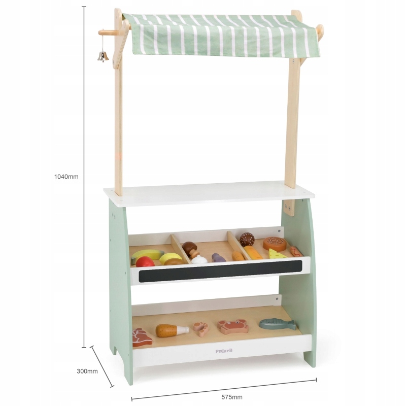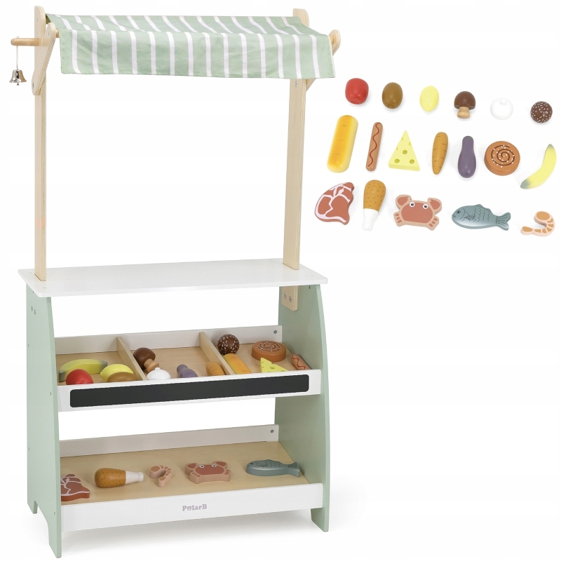 - Деревянный выставочный стенд от бренда VIGA позволит вам сыграть роль продавца на более высоком уровне удовольствия. . Ларек, выполненный из массива дерева и окрашенный в пастельные оттенки зеленого, обязательно очарует ваших детей и станет их любимым игровым уголком. Здесь есть две полки, верхняя разделена на три отдельных отсека, тканевая крыша, небольшая доска для описания продаваемых товаров и ввода цен, а также крошечный колокольчик для привлечения внимания покупателей. В комплект входит 18 продуктов питания, благодаря которым этот прилавок останется пустым.