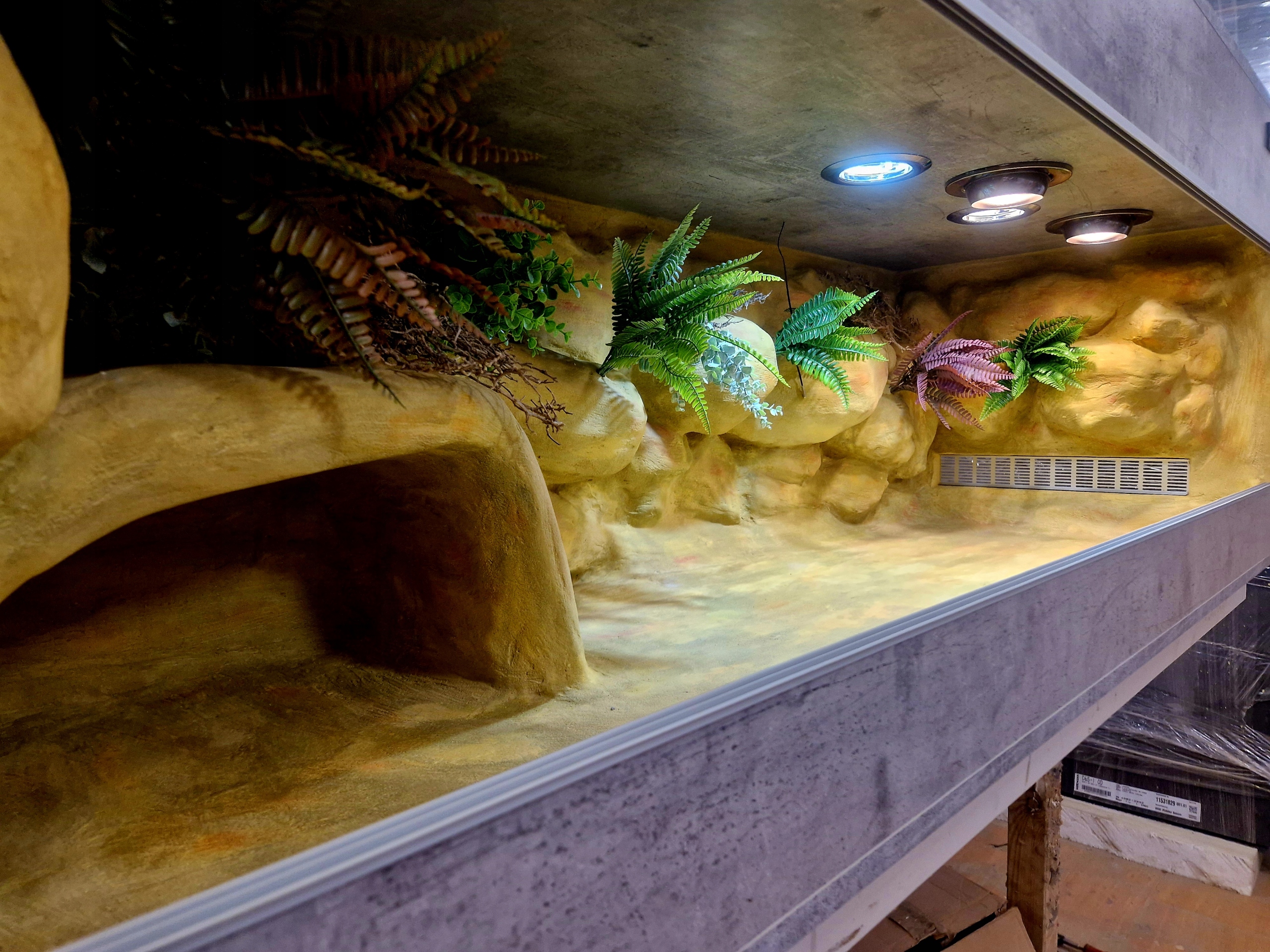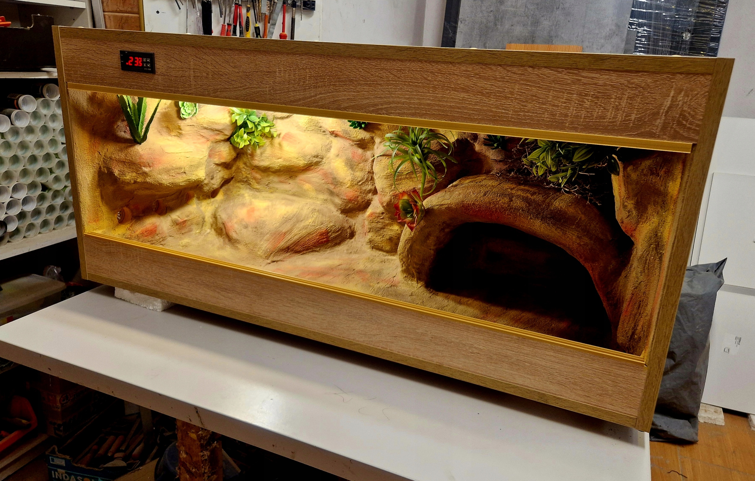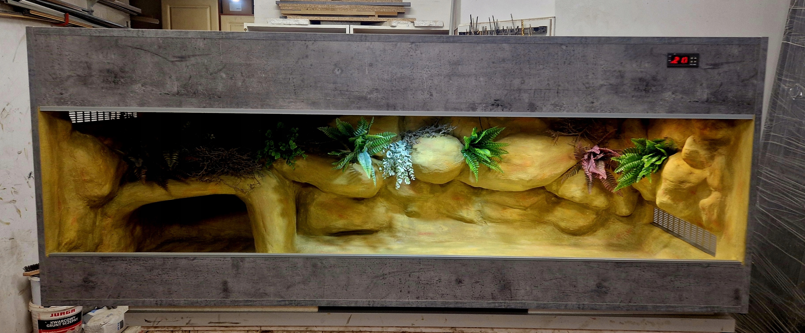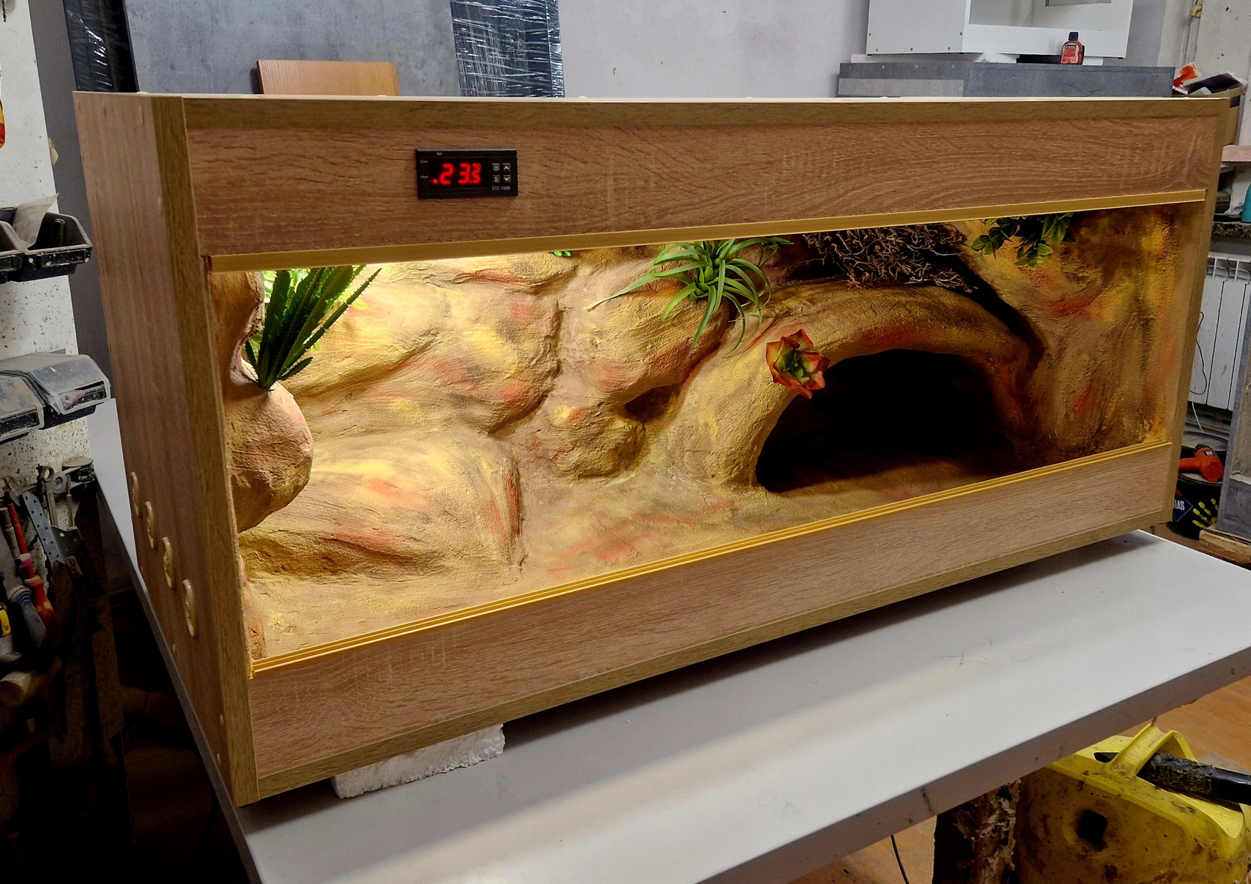 Размер бака должен быть соответствующим образом адаптирован к размерам и возрасту животного. Террария, заказанная вами, не будет копией, как представленная ниже, но они могут быть похожи. Мы строим каждый бак с нуля. Покупатель имеет возможность выбрать камень (насколько это возможно) и цвет фона террариума.