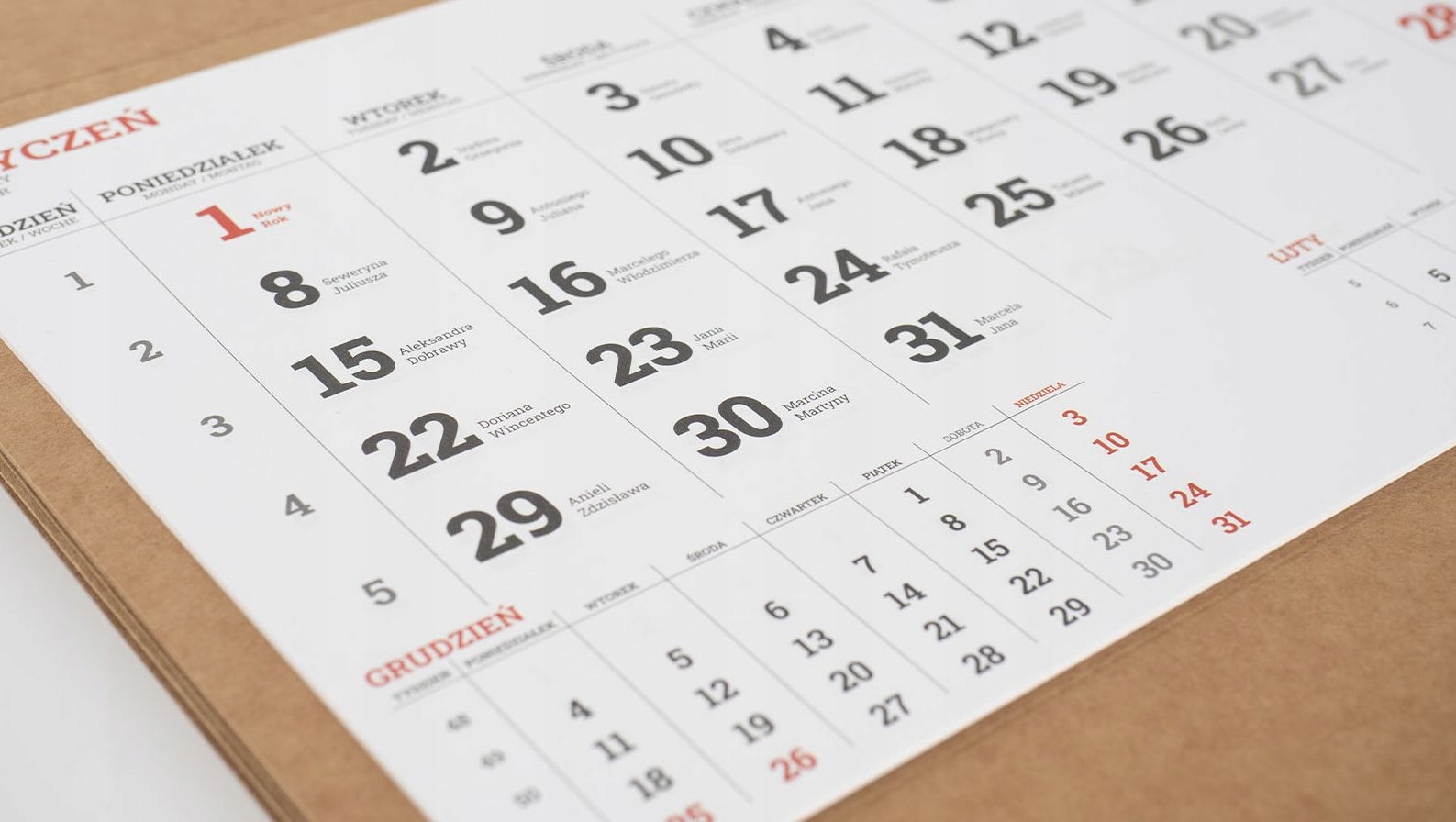 Головная/задняя часть этой модели календаря напечатана в полноцветном режиме, но без использования белого цвета, что позволяет реализовать любой графический дизайн, размещать логотипы компаний, фотографии, тексты в любом формате. цвета. В качестве основы для печати используется бумага KRAFTLINER плотностью 300 г, гарантирующая очень хорошее качество цветопередачи. Эта бумага отличается уникальной поверхностью. Одна сторона бумаги гладкая и коричневый, который придает элегантность и обеспечивает идеальную печать графики, тогда как другая сторона серая и шероховатая. Эти особенности делают Krafliner 300 г отличным выбором для создания прочных, стильных и функциональных календарей, которые выделяются как визуально, так и практично. В верхней части головки имеется отверстие для подвешивания календаря. Верхний край календаря дополнительно загнут и проклеен, что повышает его жесткость. В середине календаря над календарем есть линия сгиба, что позволяет легко сложить его пополам. Головка календаря является и ее спинкой – календарь приклеен к головке в нижней ее части.