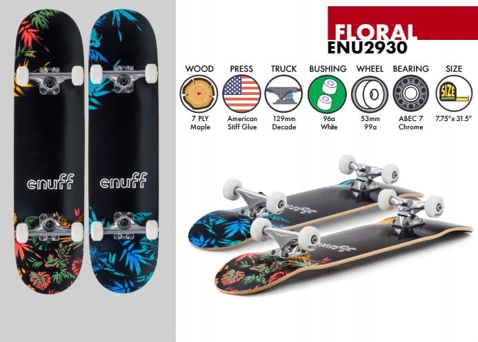Скейтборд Enuff Floral Complete, входящий в серию, посвященную 10-летнему юбилею, имеет стильный листовой вид и высококачественные компоненты, что делает его отличным комплектом для активного отдыха.
