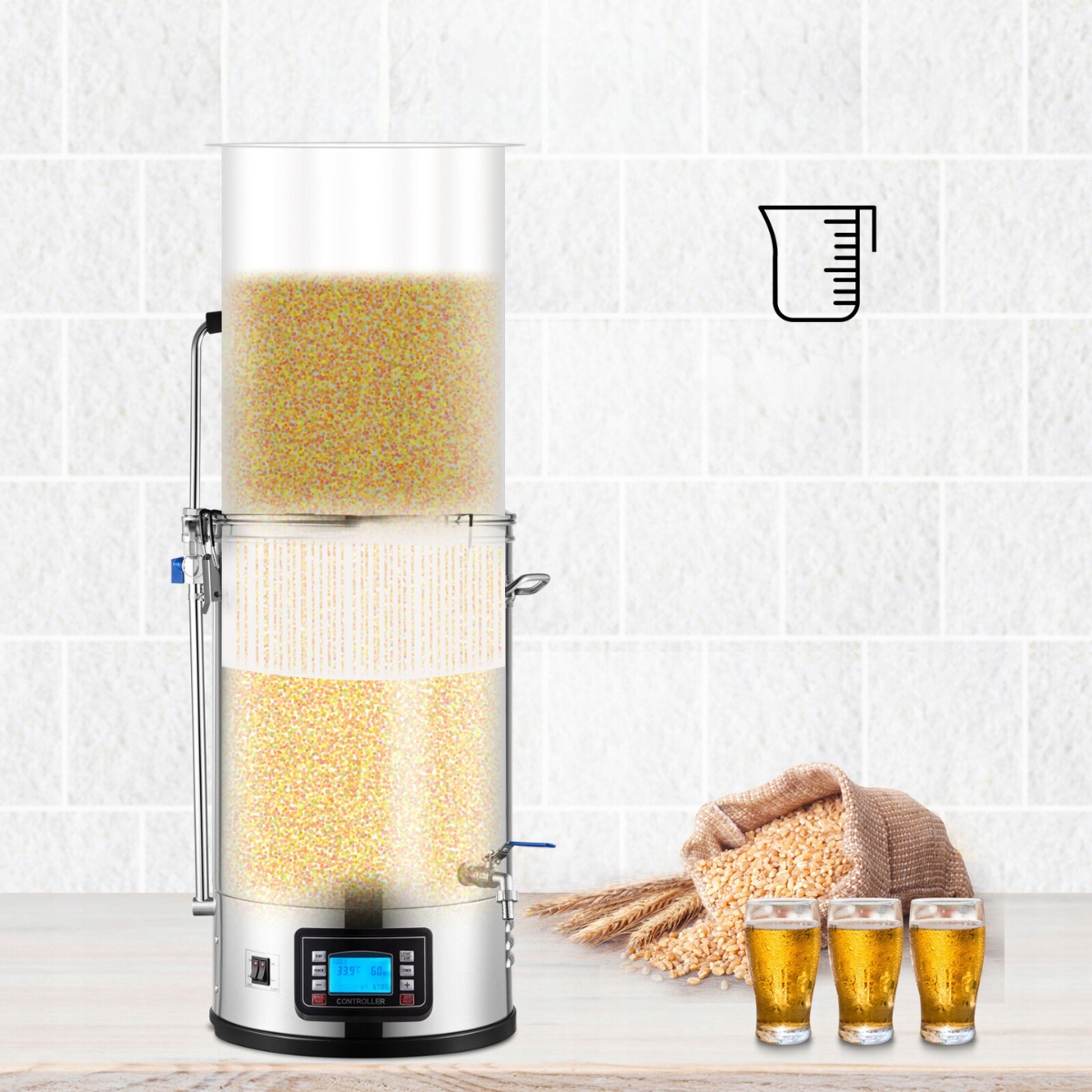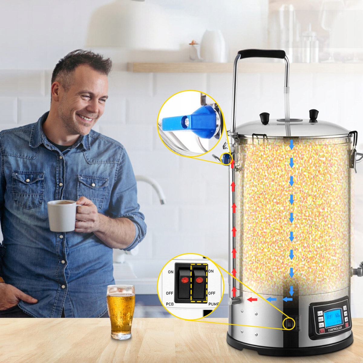✔ Большая емкость заваривания: Система имеет чашу емкостью 35 л и может весить до 30 л пива b>, что позволяет затирать до 8 кг солода за раз. Это идеальное решение для домашнего и коммерческого использования.