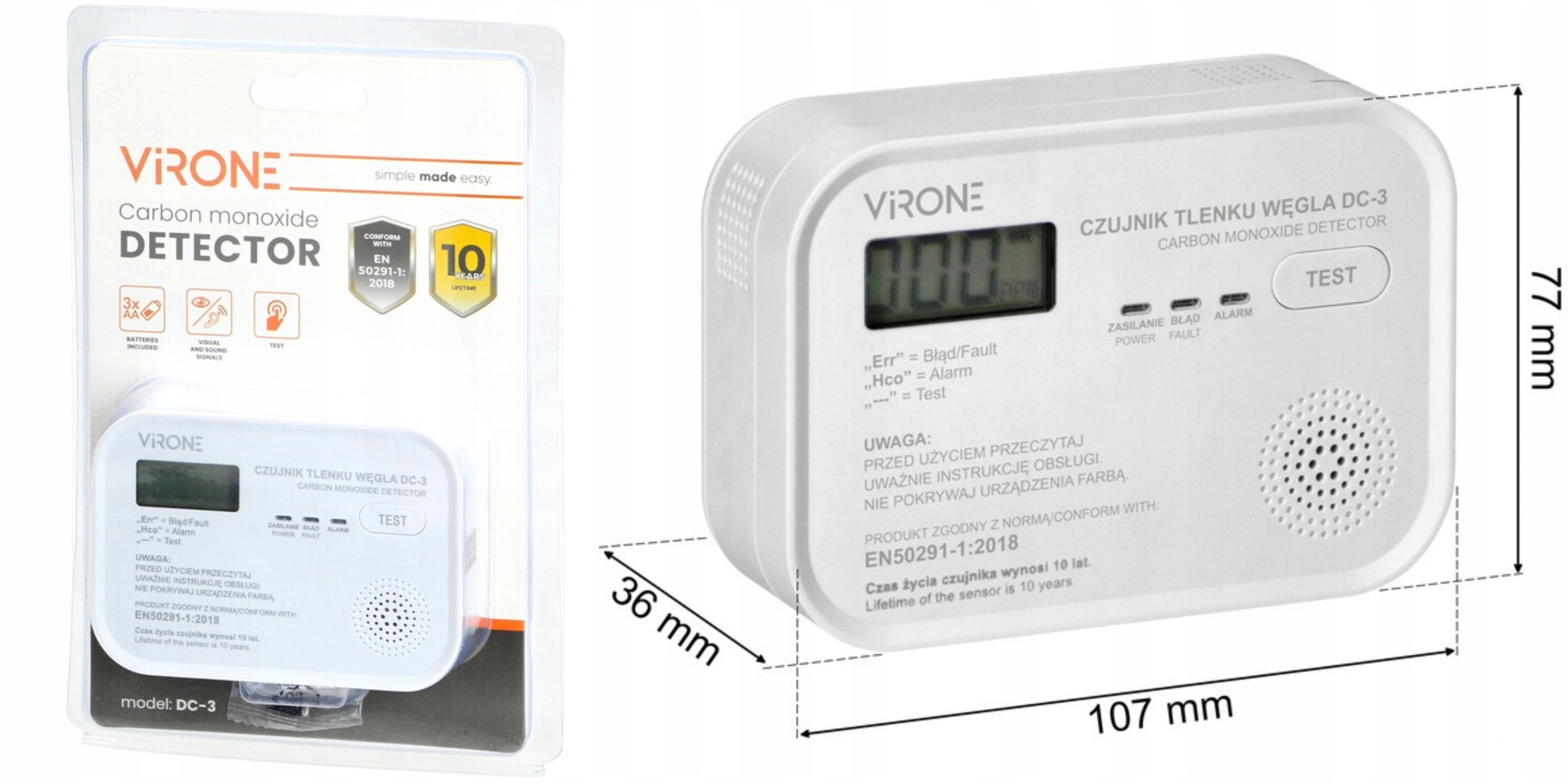 Датчик угарного газа используется для постоянного контроля присутствия угарного газа в воздухе, а также для обнаружения и оповещения о превышении безопасной концентрации этого газа. Детектор угарного газа VIRONE DC-3 соответствует строгому стандарту EN 50291-1:2018 для бытовых детекторов угарного газа.