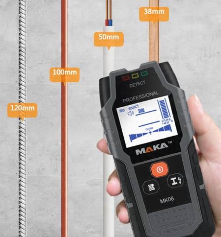 кабельный детектор Maka Mak-08 был разработан с использованием новейшей системы Advanced Sensor, которая точно и эффективно определяет: провода, деревянные элементы деревянных объектов, например, Усиление стержней
