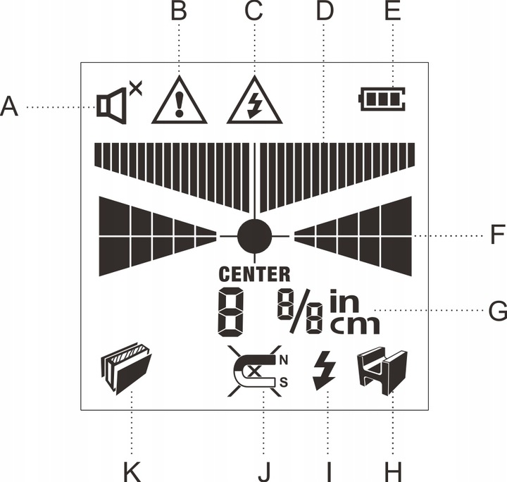 - D: Кнопка включения обнаружения металлических материалы и провода под напряжением.