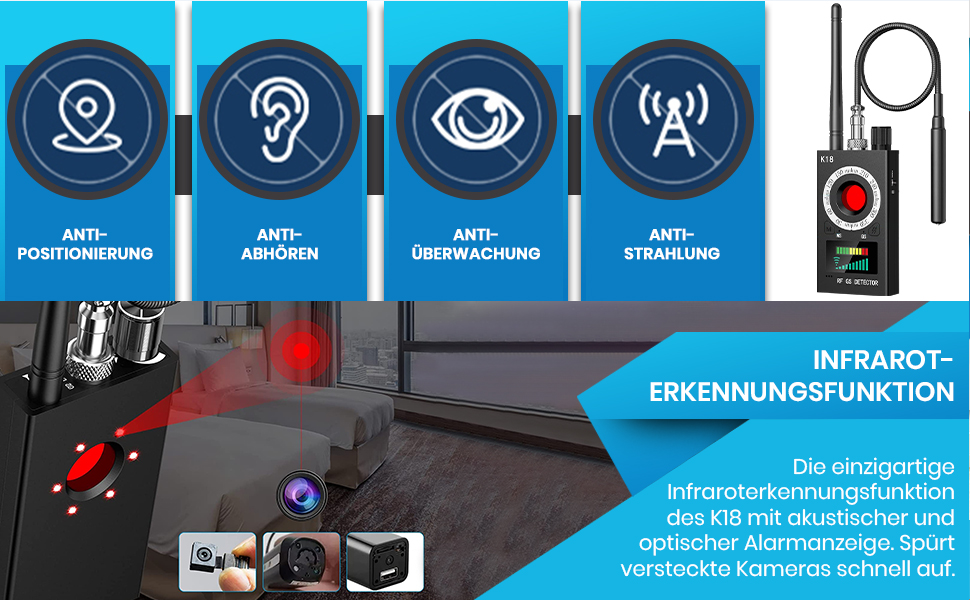 p>Может обнаруживать беспроводные камеры от 1,2 до 5,8G и обнаруживать ошибки магнитного местоположения GPS в режиме ожидания.