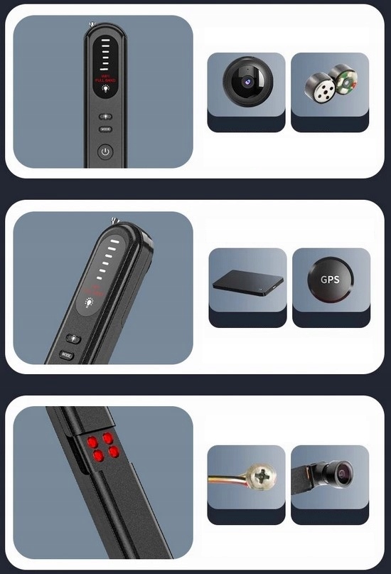 - Универсальное обнаружение: Детектор T01 эффективно идентифицирует широкий спектр устройств от 1 МГц до 6,5 ГГц, включая беспроводные камеры. и GPS-трекеры.