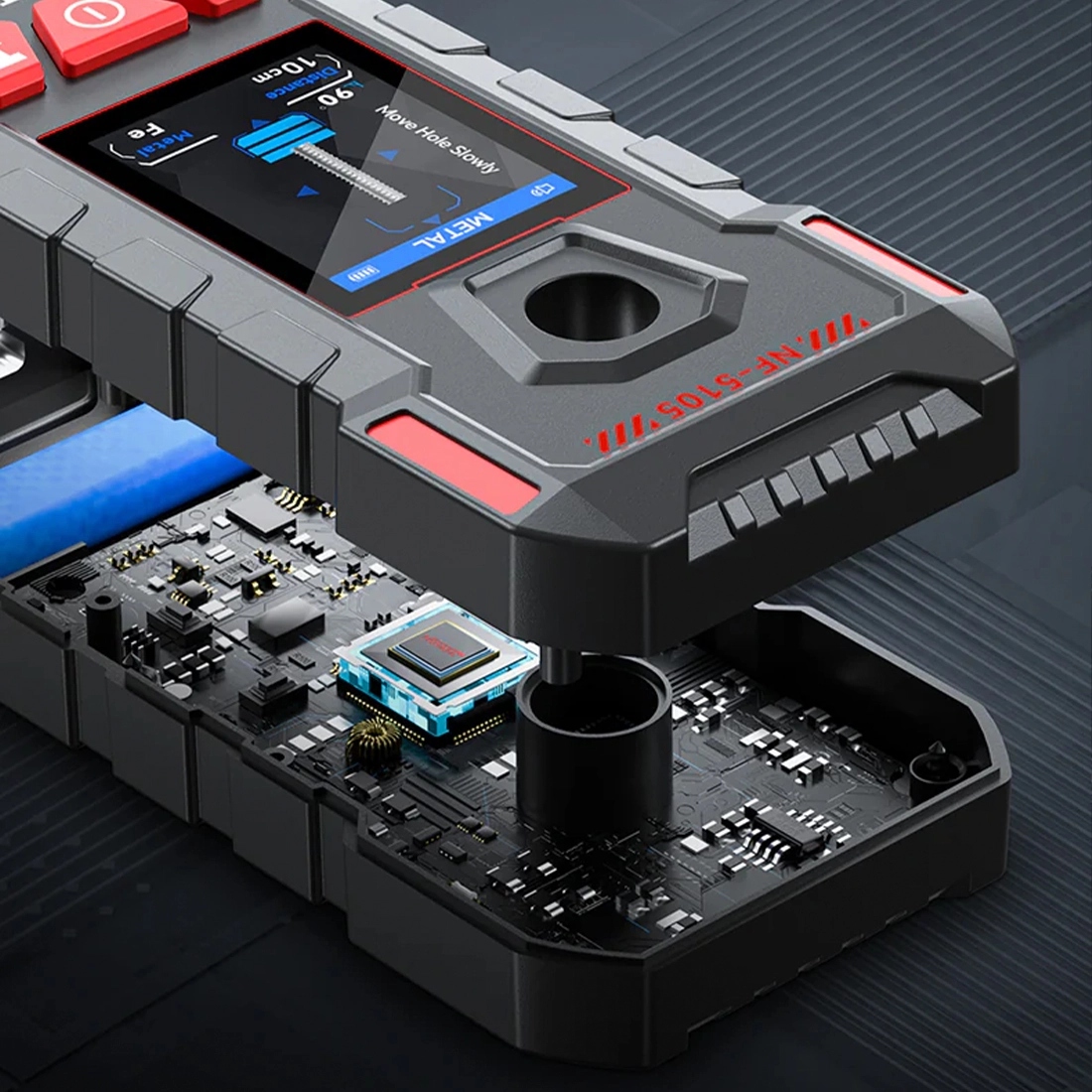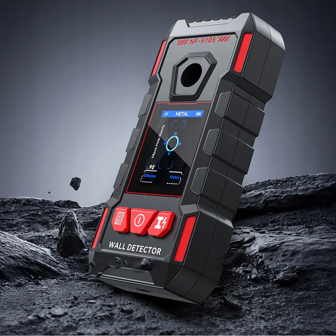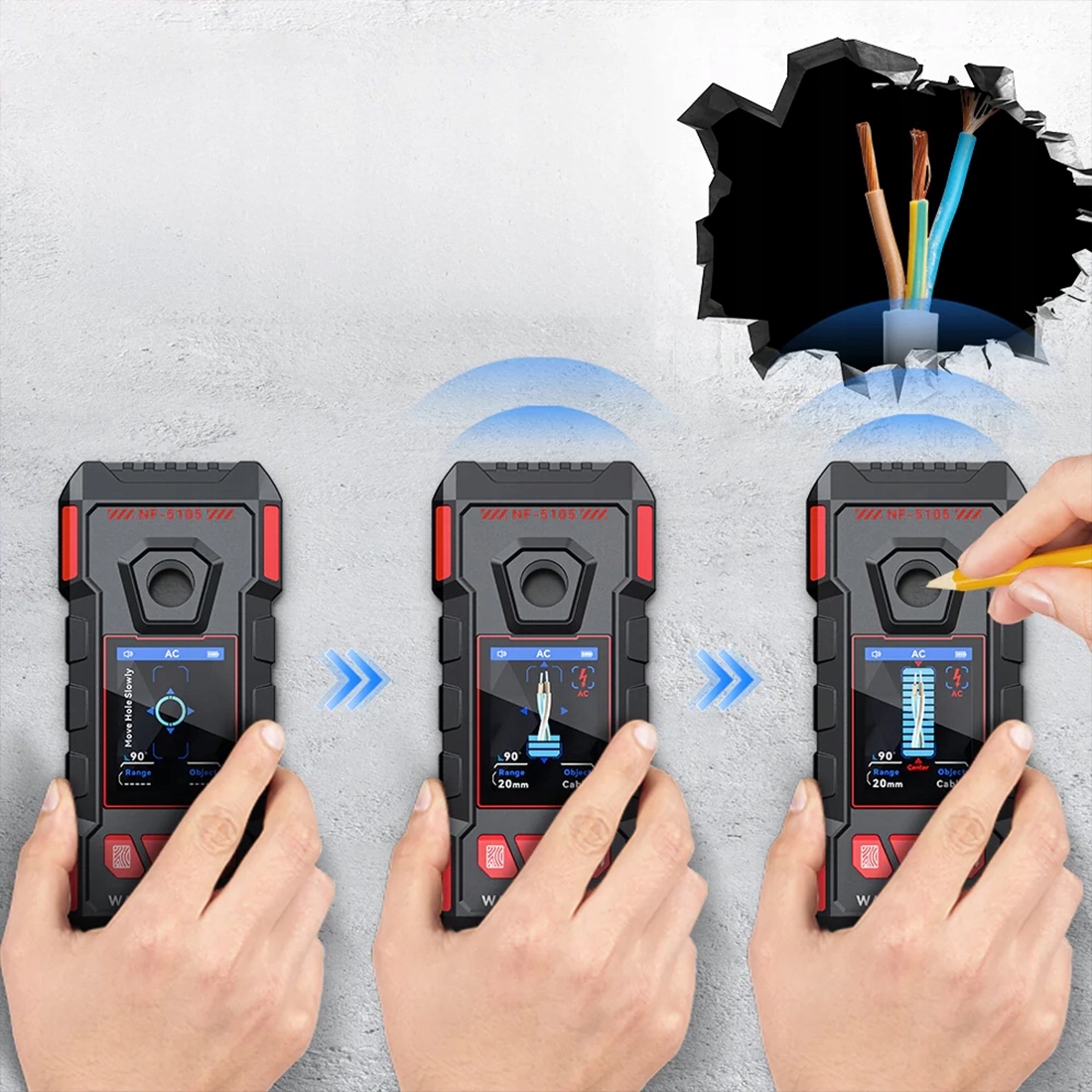 Noyafa NF-5105 используется во многих ситуациях – от внутренней отделки и установки каркасов, установки электроники и бытовой техники до строительных, ремонтных и ремонтных работ. Эксплуатация исключительно проста – просто включите детектор, поместите его на поверхность и переместите, и результаты сразу же появятся на четком экране. Центральное отверстие позволяет напрямую отмечать место сверления, что позволяет быстро и точно определить рабочую точку.