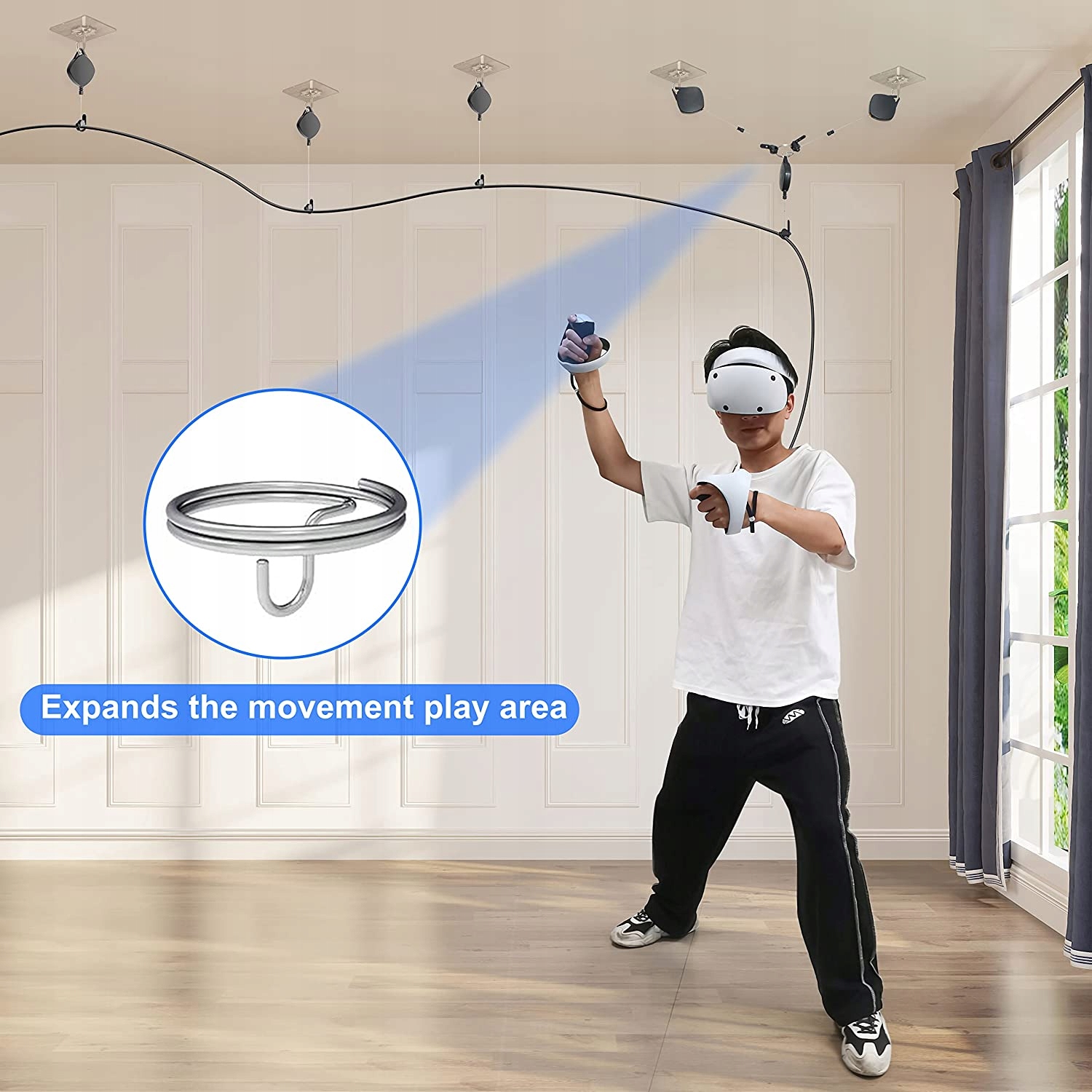 Два способа установки. Вы можете прикрепить крючки к потолку с помощью прилагаемых клейких прокладок или шурупов, в зависимости от того, хотите ли вы, чтобы они были постоянными или нет, и от типа вашего потолка. Выдвижной трос имеет умеренное натяжение, может выдвигаться на длину до 61 дюйма и автоматически подпрыгивать. Будь то маленькая или большая комната, наш комплект для прокладки кабелей VR прост в установке и значительно улучшит ваши игровые возможности.