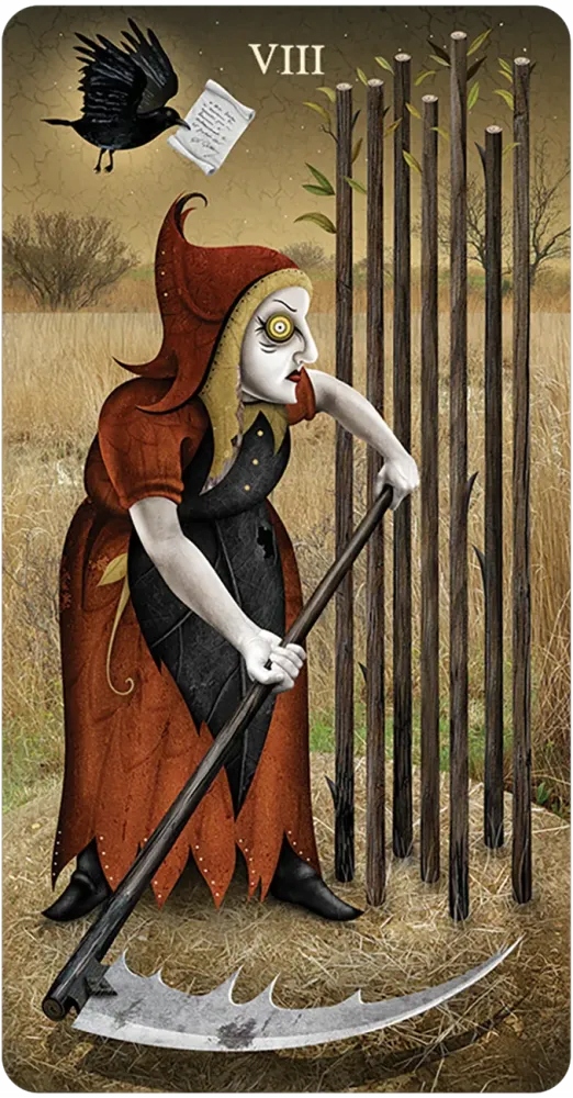 Талантливый художник Патрик Валенца представляет чрезвычайно альтернативные интерпретации традиционного Таро с символикой, вдохновленной детскими мечтами. Стилизованные персонажи с лунными лицами, созданные на основе манипулируемых фотографий надгробий 18-го века, встроены на наводящие фон. Графика интегрирована с сюрреалистическими сценами отдаленных дымовых дымоходов, укрытиями для безумных и заброшенных зданий. Благодаря более крупным картам это специальное издание без границы подчеркивает потрясающую графику Патрика Валензи и позволяет читателям глубже соединяться с наводящими изображениями Таро