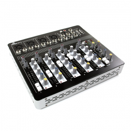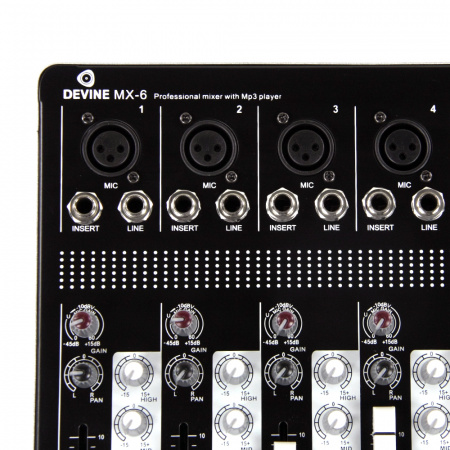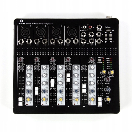 Devine MX-6-это чрезвычайно практичный компактный смеситель, который подходит для широкого спектра приложений. Он оснащен 4 моноканалами и 1 стереоканалом. Три -линейный консилер позволяет адаптировать входящий сигнал к индивидуальным предпочтениям пользователя. Кроме того, вход FX Send позволяет подключить внешний эффектор. Чрезвычайно полезным фактором является тот факт, что устройство имеет встроенный вход USB, который позволяет легко читать песни из Pendrive. Благодаря использованию тщательно выбранных компонентов микшер характеризуется высокой динамикой и очень хорошим качеством звука.