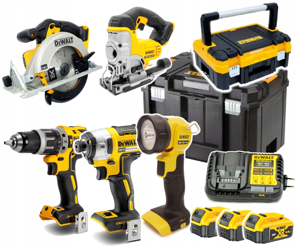 Набор инструментов DeWalt DCK551P3T: аккумуляторная ударная дрель DCD796, аккумуляторный ударный шуруповерт DCF887, аккумуляторная циркулярная пила DCS391, аккумуляторный лобзик DCS331, аккумуляторный шарнирный светильник DCL040. Аксессуары.