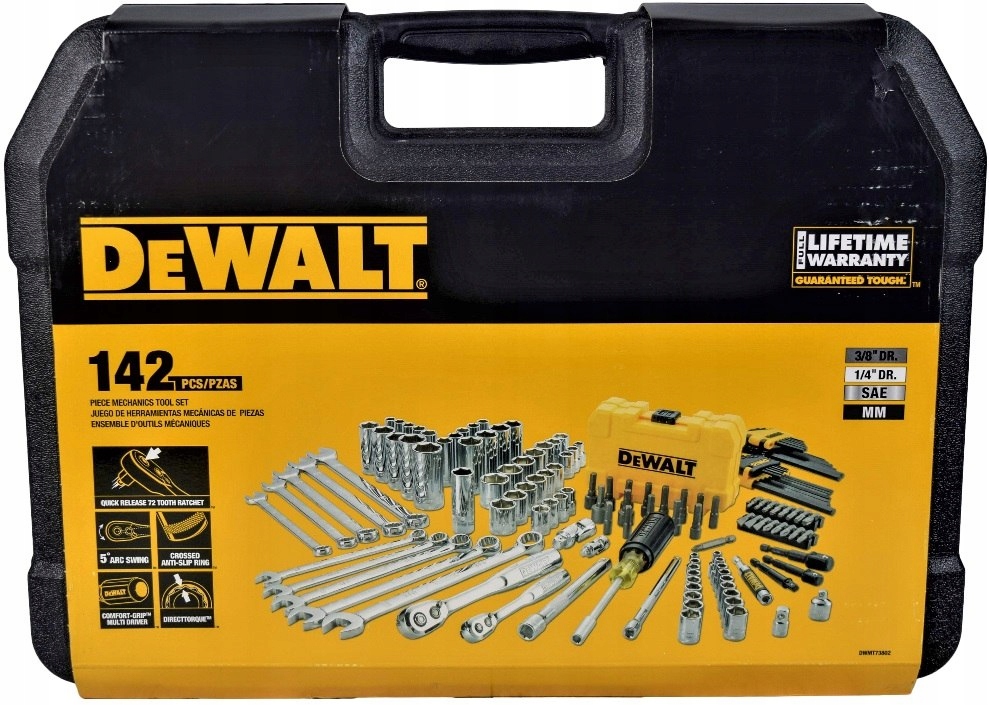 - плоские клавиши, инструменты для век 142 Элементы DWMT73802-1 DeWalt- 142 механические инструменты с универсальным использованием с двумя грушевыми грибцами, различными привязанными средствами, расширениями, универсальными соединениями и адаптерами. Набор Dwemt73802-1 DeWalt поставляется в прочном чемодане с металлическими снимками для дополнительной безопасности. Рэкины с 72 зубами оснащены быстрым кнопкой замедления, которая обеспечивает легкое соединение и удаление прикрепления. Всаждения содержат технологию Directorque ™, которая помогает предотвратить округление крепеж и обеспечивает лучшую адгезию.