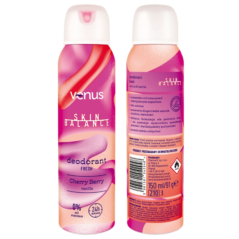 Новый дезодорант с Венеры - идеальное решение для людей, которые ищут свежесть и защиту в течение дня. благодаря деликатной формуле с запахом вишни и ванили обеспечивает надежную защиту от неприятных запахов. Это оставляет длительное ощущение комфорта и свежести, что позволяет коже дышать. Кроме того, его мягкая формула не раздражает кожу, даже после бритья или депиляции под подмышками, , что делает ежедневное уход до удовольствия.
