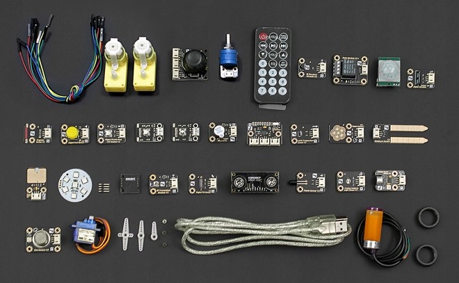 В комплект входит более 30 электронных компонентов для людей, уже имеющих опыт работы с Arduino. В комплект входят, среди прочего: Плата DFRduino Mega 2560 (совместима с Arduino Mega 2560), дисплей, реле, светодиоды, датчики, устройства связи и моторы с драйверами.