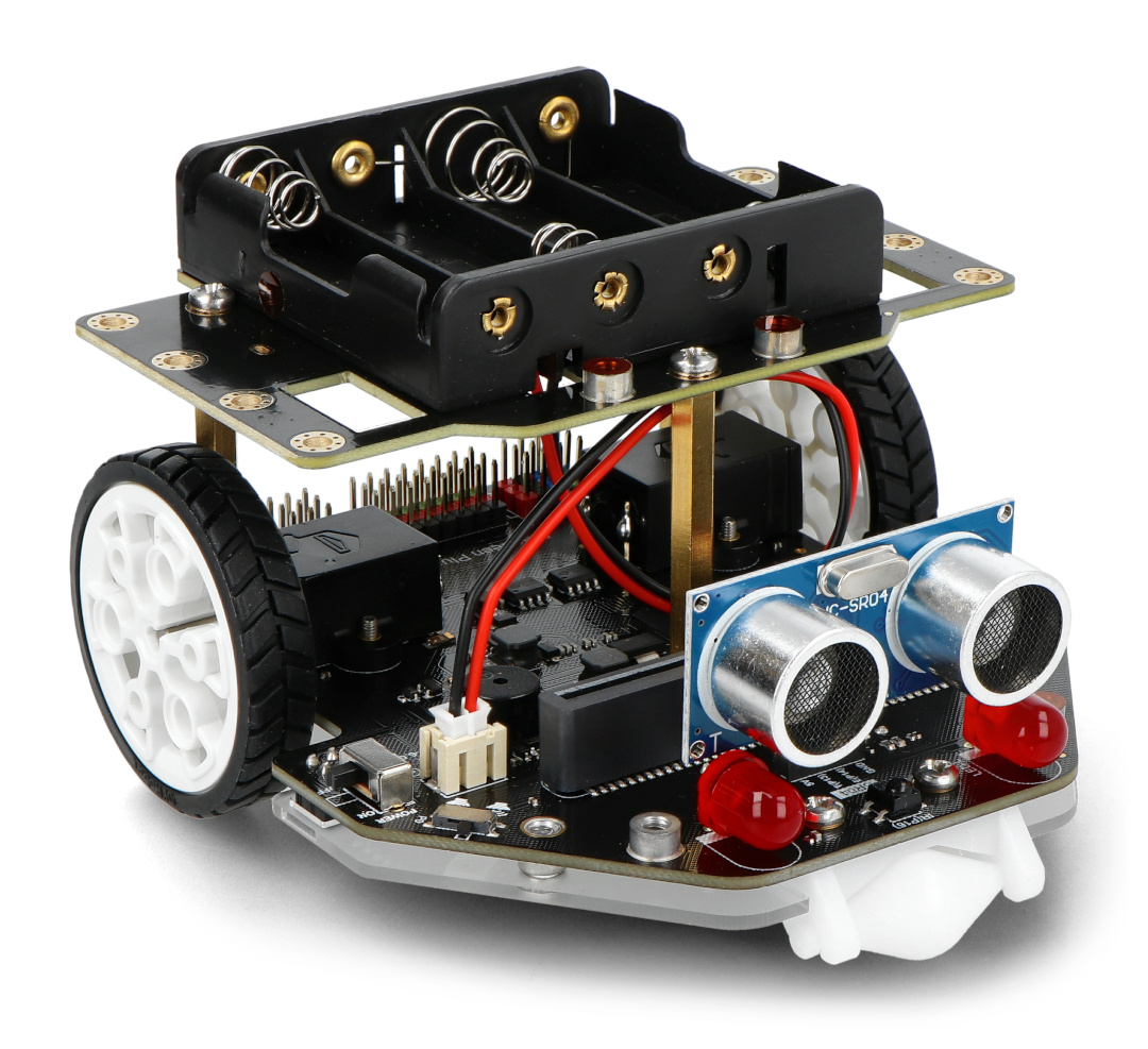 Платформа робота оснащена высококачественными металлическими двигателями со скоростью 266 об/мин и энкодерами с ПИД-управлением. Робот также имеет 2 больших светодиода, которые могут светиться 6 разными цветами, ИК-приемник и зуммер, а также ультразвуковой датчик.