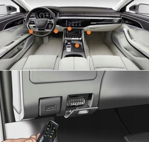 Чаще всего он находится в водительском пространстве (под приборной панелью), в центральной части автомобиля или реже возле средний туннель и подлокотник.