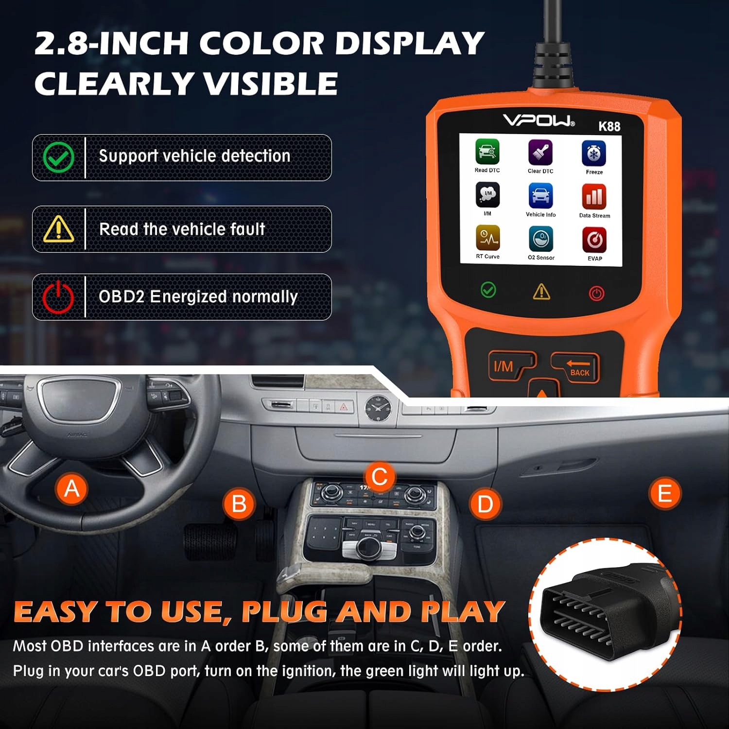 Простой в использовании: просто подключите и используйте: сканер Repl2, оснащенный 2,8-дюймовым цветным ЖК-экраном, предлагает супер-прозрачные результаты испытаний; Диагностический инструмент автомобиля оснащен трехместным 3-футовым каналом и изготовлен из очень густого гибкого изолятора. На диагностическом сканере автомобиля есть 7 кнопок: прокрутка вверх/вниз, влево/справа, ОК/задние и кнопки, определяющие состояние готовности i/m. Диагностический инструмент для кодов ошибок чтения не требует батареи или зарядного устройства, поскольку он питается непосредственно из разъема данных OBDIA в транспортном средстве.