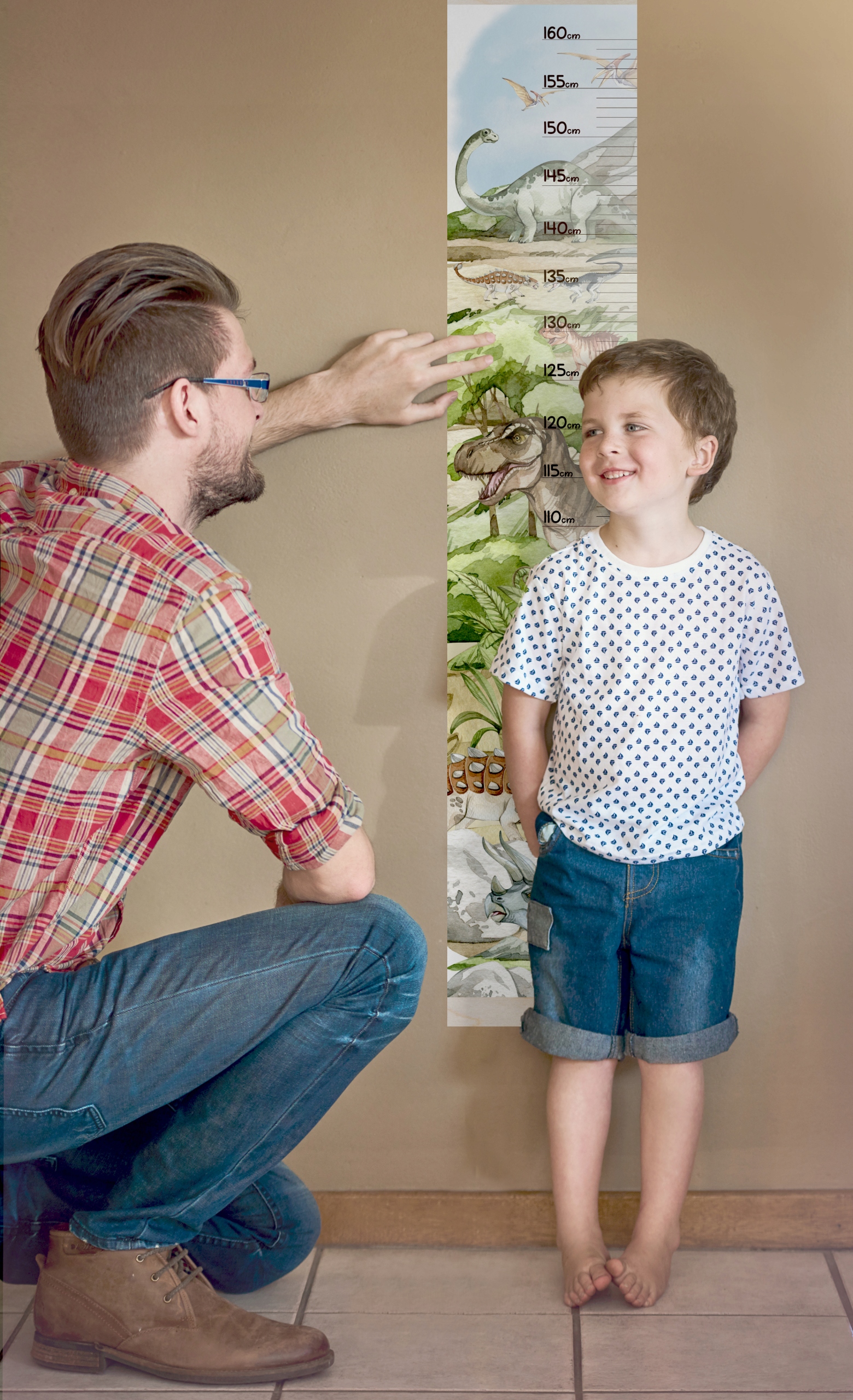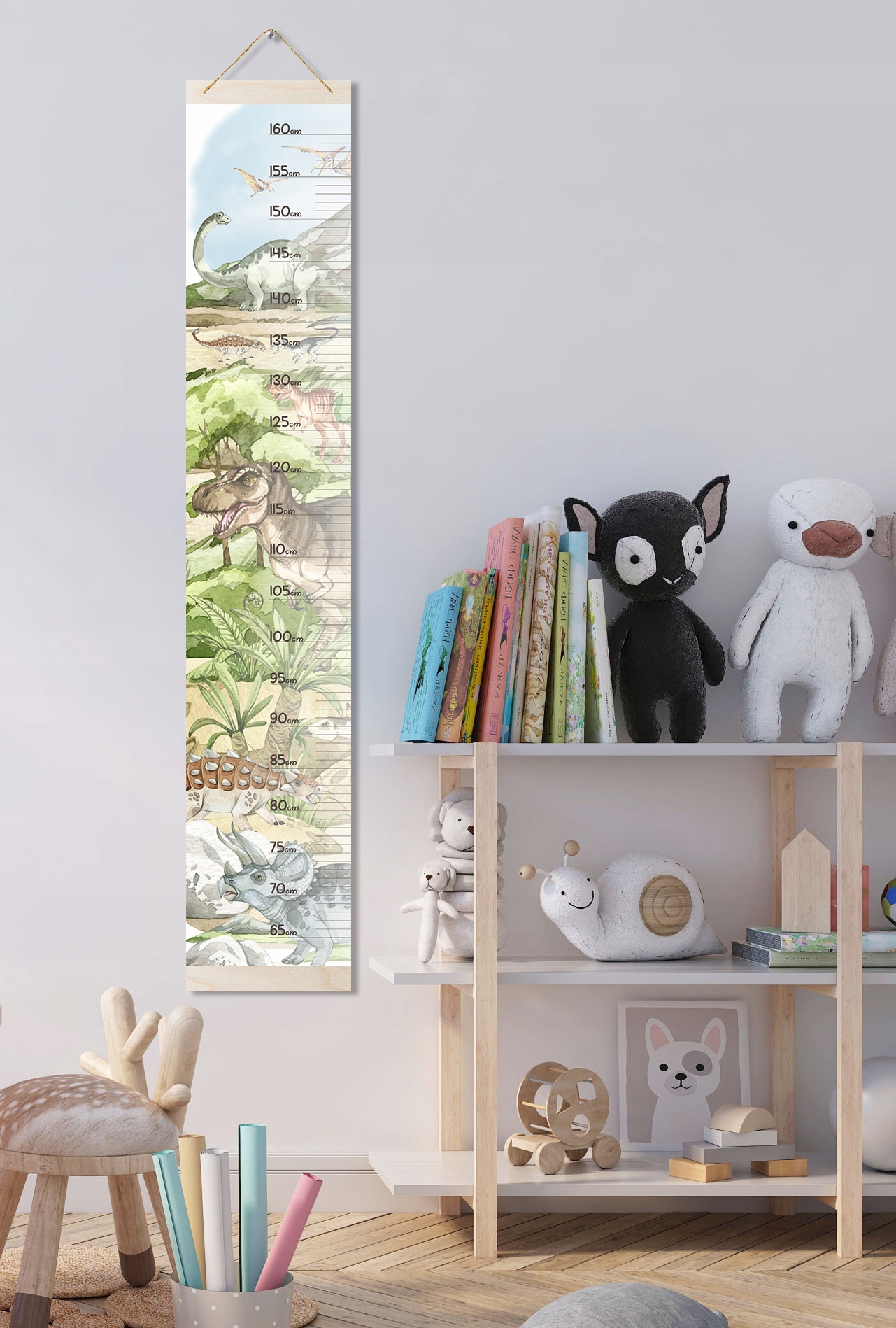 Красочные таблицы роста с доисторическими животными - отличное украшение детской комнаты. Узор с мотивом динозавра понравится каждому любителю животных. Благодаря установке на веревочку украшение можно использовать долгое время, его можно свободно повесить и снять, например, для ремонта.
