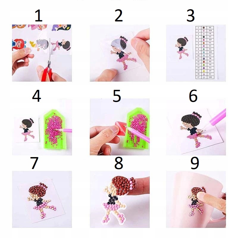 <р>1. Вырежьте одну наклейку. <р>2. Верхняя часть наклейки покрыта клеем. который прикрепляет бриллианты к наклейке. Снимите защитную пленку <р>3. В комплект входит алмазный индекс, соответствующий цветам наклейки <р>4. Выберите бриллианты, которые вы расположите. Номера на пакетиках и на наклейке будут вам полезны. Затем высыпьте их в лоток. <р>5. С помощью аппликатора, который называется ручкой, вы наклеите на наклейку ромбы. Обмакните аппликатор в сухой клей, это позволит перенести ромбы. <р>6. С помощью аппликатора нанесите ромбы на наклейку.7-8 После окончания приклеивания прижмите все, чтобы выровнять и приклеить ромбы. Снимите нижний слой.