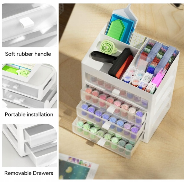 - Хранение высокой емкости: система хранения ArtDot имеет 4 ящика, а верхняя подставка для легкой организации и классификации всех бусин и художественных инструментов, и в то же время чрезвычайно переносимо и идеально подходит для создания алмаза. Верхняя подставка предоставляет много отсеков для наборов алмазов. Различные размеры соответствуют хранению ручек, таких как ролики, клей, наклейки, пинцет, контейнеры для хранения и другие алмазные аксессуары и инструменты. Он может разместить 192 разных цветов в наборе. Сделанный из акрилового устойчивости к трещину высочайшего качества, держите ваши алмазные бусины в чистоте и порядке. Попрощайтесь с грязными переводами! В наборе пустая наклейка на контейнере помогает быстро и легко идентифицировать содержание внутри. Предметы