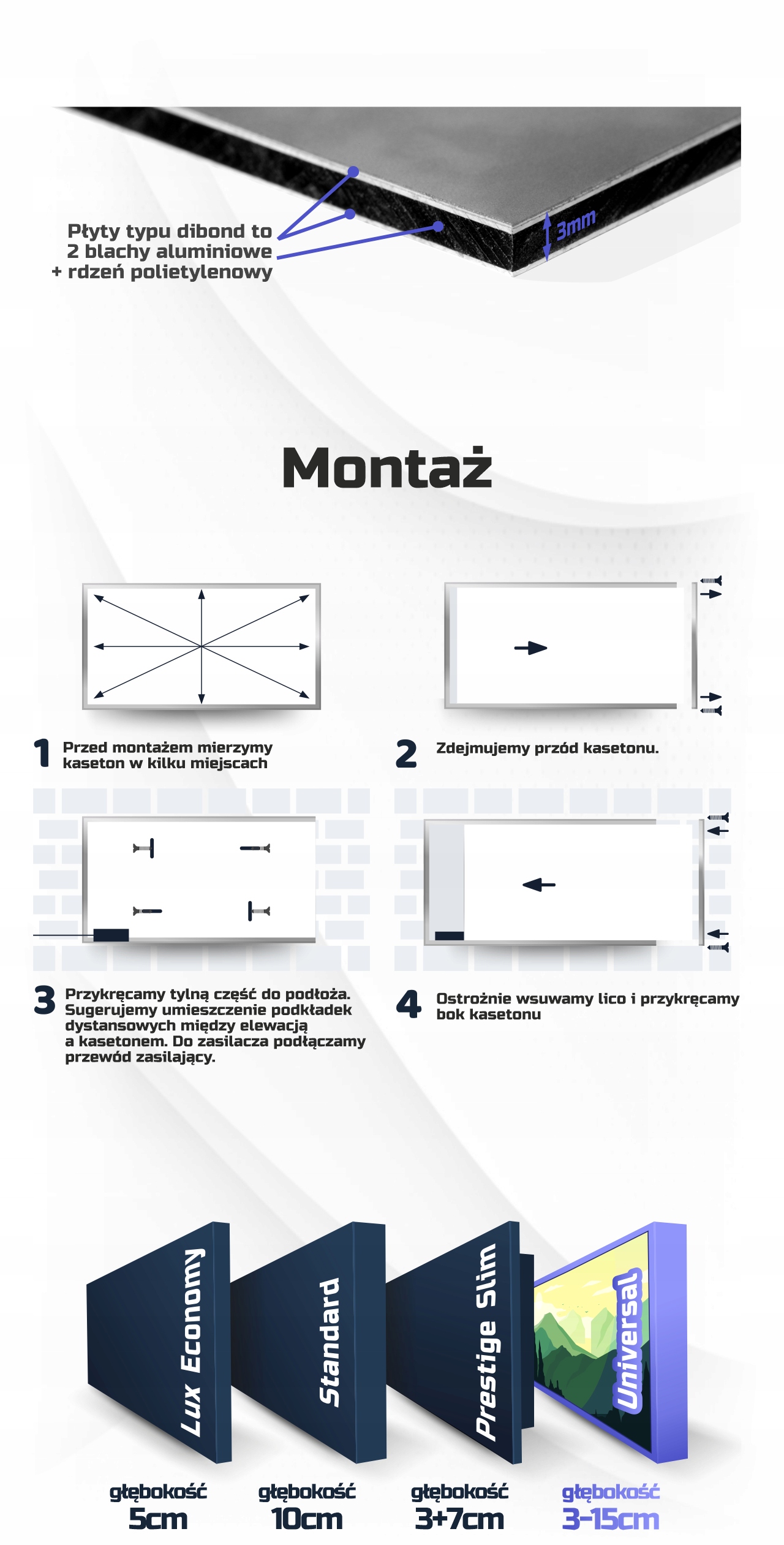 Наши кессоны отличаются не только прочностью конструкции Dibond, но и простотой сборки, что делает их идеальным выбором для широкого спектра получатели. Максимальные размеры коробок серии UNIVERSAL — 370х120 см, что дает вам большую свободу.