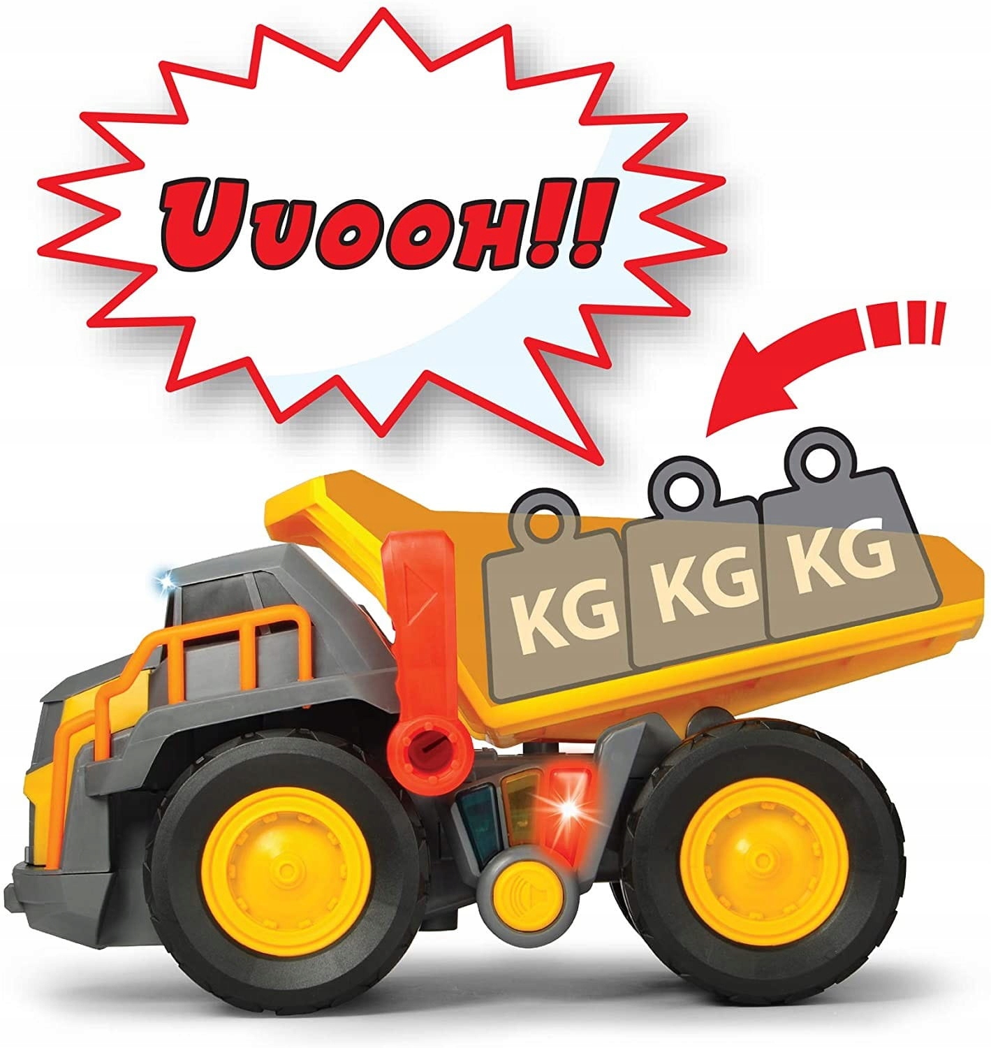 Город расширяется впечатляющими темпами, и соответствующий транспорт, несомненно, пригодится – большой экскаватор или самосвал (продаются отдельно). Самосвал – отличная идея для маленьких любителей строительной техники. Транспортное средство оснащено световыми и звуковыми эффектами. Особой изюминкой является подвижная погрузочная поверхность самосвала, которая определяет вес груза и соответствующим образом регулирует световые и звуковые эффекты. Он реагирует на 3 различные нагрузки включением светового и предупреждающего звукового сигнала (зеленый – легкая нагрузка, желтый – средняя нагрузка, красный – слишком большая нагрузка). Благодаря этой уникальной функции самосвал Volvo гарантирует много часов отличного удовольствия, а также знакомит малыша с основными принципами техники. Транспортное средство изготовлено из пластика и имеет подвижные пластиковые колеса.