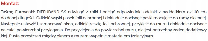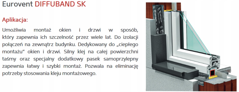 Eurovent® DIFFUBAND SK паропроницаемая оконная лента для наружной изоляции монтажных отверстий в окнах, жалюзи и дверях с использованием т.н. «Теплое собрание». Изготавливается из специального нетканого полотна, покрытого с одной стороны по всей ширине слоем высокоадгезионного клея, что облегчает его приклеивание к оконной раме или стене.