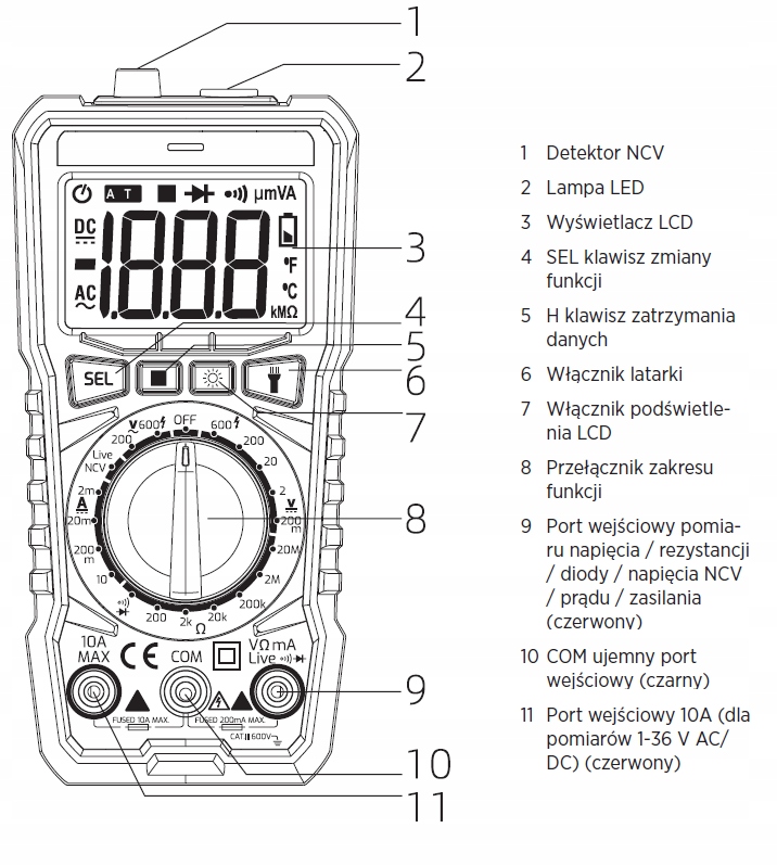 - Функции измерения: Измерение переменного/постоянного напряжения, постоянного тока (DC), сопротивления, проверка диодов и целостности цепи, обнаружение нейтрального провода и бесконтактное обнаружение напряжения (NCV).