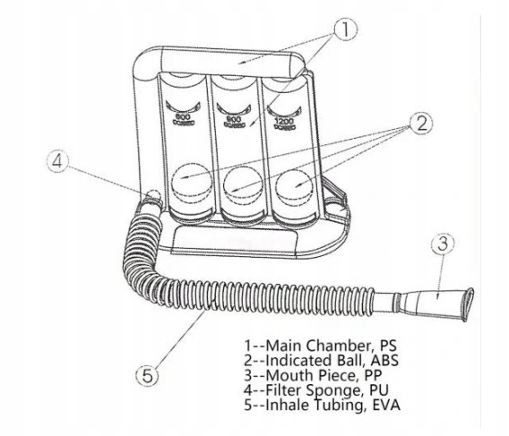 Прибор для дыхания на вдохе. Устройство для тренировки проходимости дыхательных путей, помогающее пациенту восстановить нормальное дыхание после операций на грудной клетке или брюшной полости. Устройство состоит из: 1 основания, 3 маленьких шариков разного размера и цвета, 1 прозрачной средней части, разделенной на 3 камеры, 1 трубки с мундштуком. Основание и маленькие шарики из нетоксичного полипропилена. Центральная часть из сополимера/нетоксичного полистирола. Тюбик с мундштуком из полиэтилена.