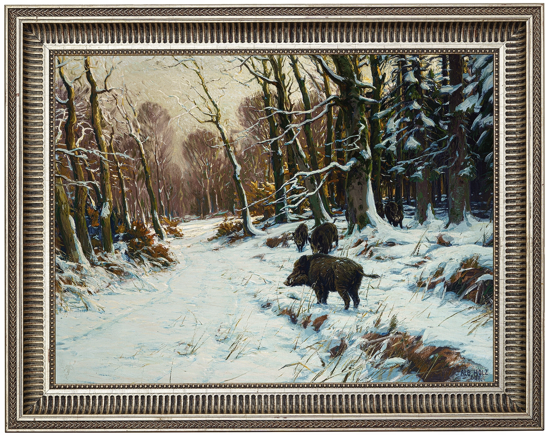 Альберт Хольц, немецкий художник; первоначально был самоучкой, затем в 1908-1920 годах учился частным образом в мастерских дюссельдорфских художников К.Крёнера и Г.Хакера. Он начинал как художник, изображающий городские пейзажи; его первыми картинами, выставленными в Дюссельдорфе, были «Вид из Нойсса» и «Рынок Дюссельдорфа». Позже он также писал атмосферные пейзажи, в том числе: от гор Эйфель, Мозеля или Нижней Рейнской области. Чаще всего это были картины с животными мотивами – стадами овец, лошадей, дичи. Кроме того, он сотрудничал с Дюссельдорфским городским театром, а для местного зоопарка писал охотничьи картины «В африканской степи» и «В северных землях». Он не датировал свои картины.