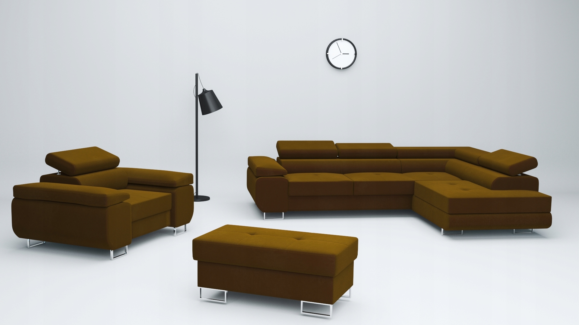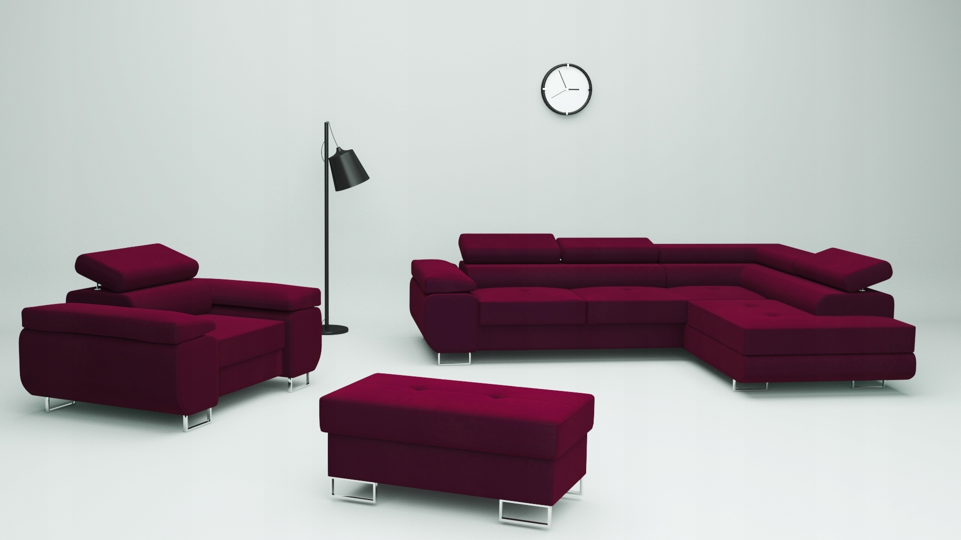 Современный комплект для отдыха, состоящий из функционального углового дивана, удобного кресла и открывающегося пуфа. 4-ступенчатая регулировка подголовника. Всегда полезная спальная функция и контейнер для постельного белья. Сделано с исключительным вниманием к деталям. Дизайн, который привлекает внимание с первого взгляда. Комфорт использования благодаря волновой пружинной технологии и очень гибкому пенопласту. Прочный каркас представляет собой сочетание дерева и ДСП.