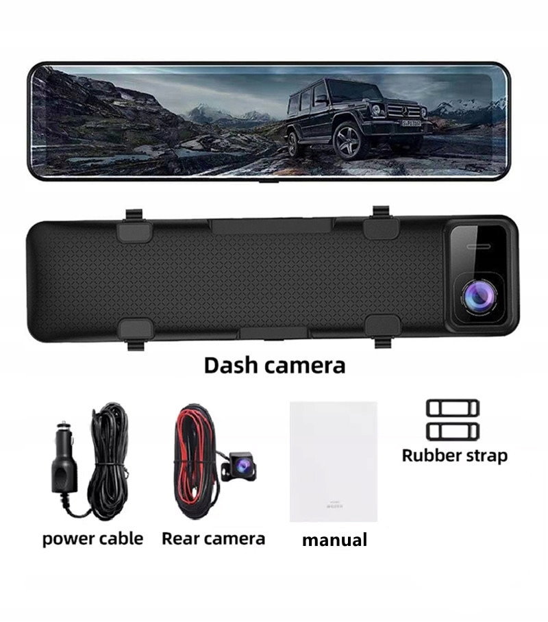 DVR, зеркало заднего вида (кабель камеры 6 м), видеорегистратор, камера заднего вида, сенсорный экран 12 дюймы, камера, автоматический запуск, режим контроля парковки, датчик движения, запись звука, 3-осевой g-сенсор - G-сенсор, режим парковки, циклическая запись, встроенный микрофон и динамик, устройство чтения карт памяти TF/SD до 128 ГБ, разъем mini USB, отличное ночное видение, передняя камера угол обзора 170° (2160P) и задний 140° (1080P) HDR, WDR, а также: