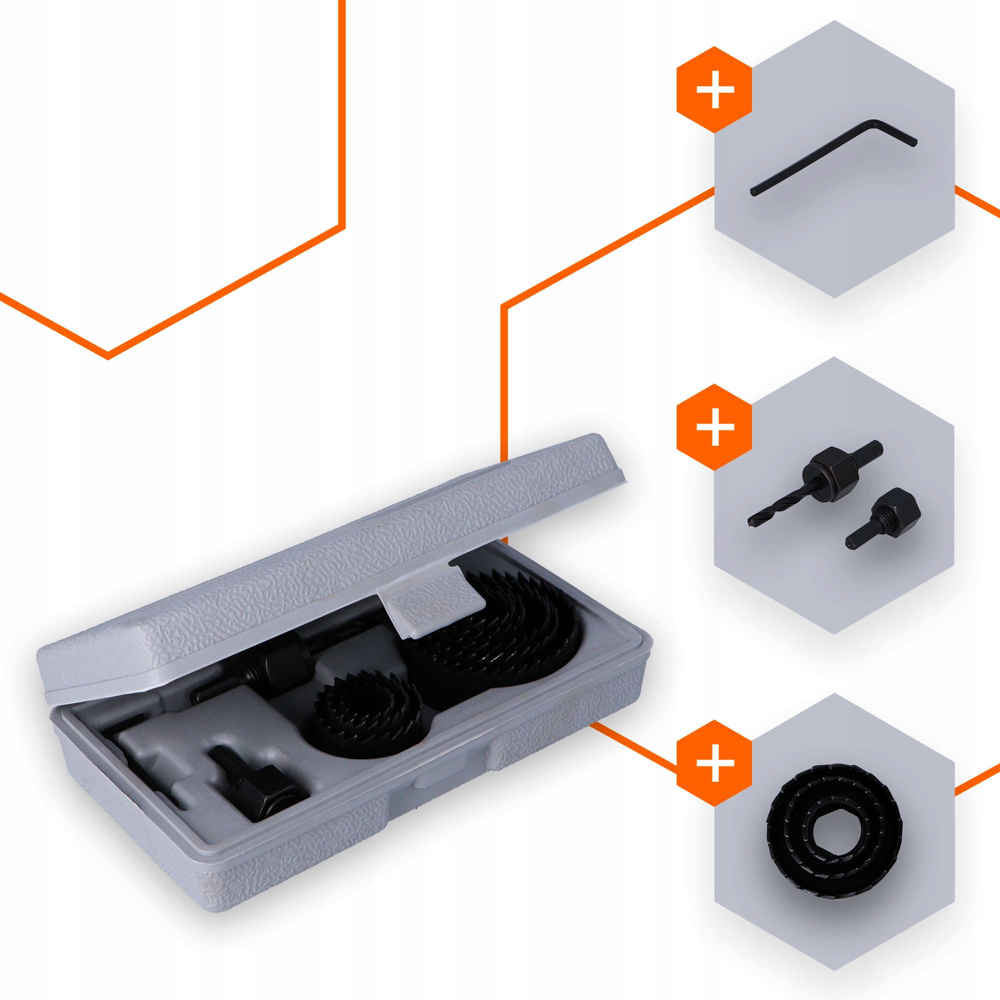 В наборе целых 8 фрез популярных диаметров: 19, 22, 29, 32, 38, 44, 51 и 64 мм. Столь широкий ассортимент позволяет легко адаптировать инструмент под конкретную задачу – от установки электрокоробок до подготовки отверстий под осветительные приборы.