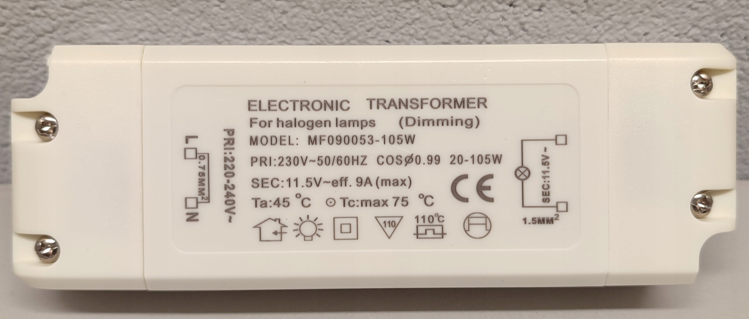 - Электронный трансформатор с регулируемой яркостью: вход переменного тока 220–240 В, 50/60 Гц. Выходной ток: 11,5–12 В (макс. 9 А), выходная мощность: 20–105 Вт. Совет: с регулируемой яркостью для галогенных ламп и без регулировки для светодиодных.
