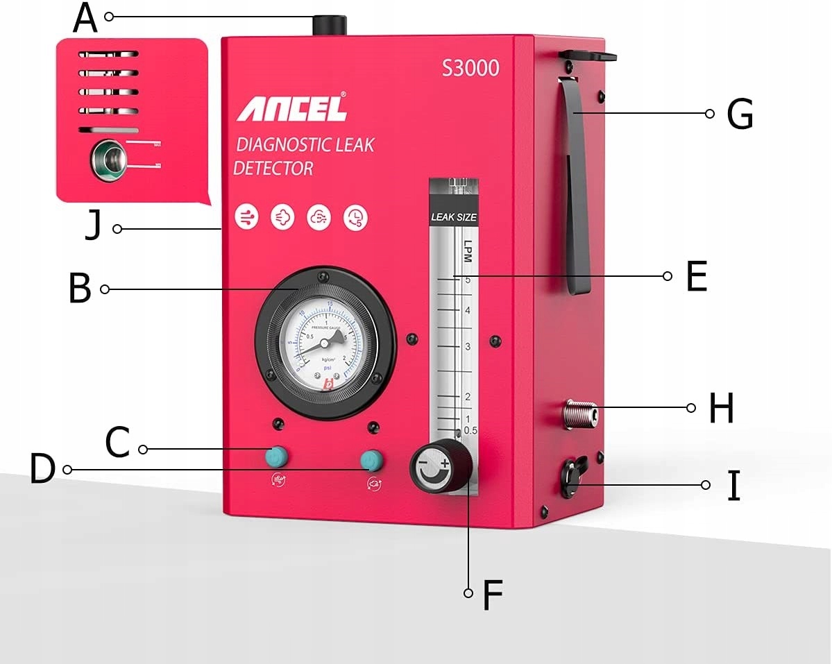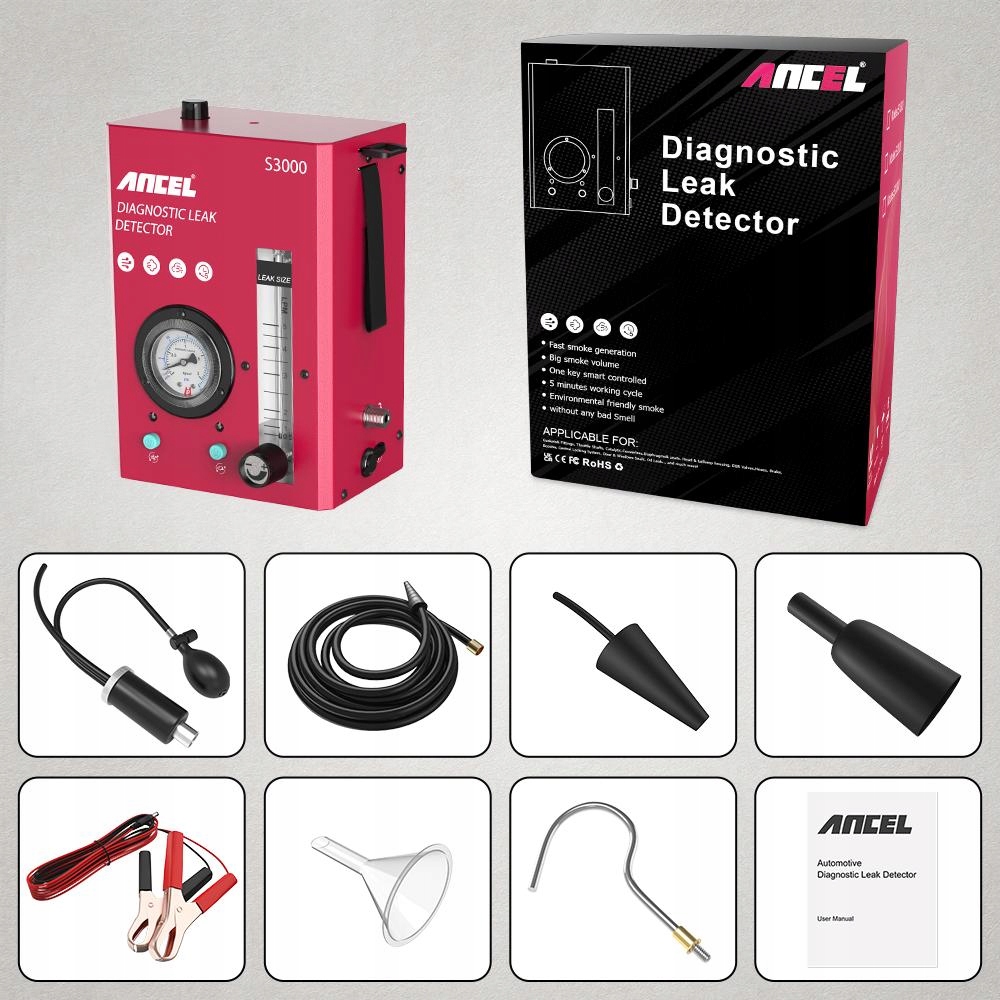 Автомобильный детектор утечки дыма ANCEL S3000 — профессиональный инструмент для обнаружения утечек в автоматических трубах. Это поможет нам быстро и точно определить утечку в мотоциклах, автомобилях, в системах трубопроводов, например, проверка впускной системы, проверка выхлопной системы, проверка системы кривошипа, проверка автомобильных уплотнений, проверка системы топливного бака, проверка турбосистемы и т. д.