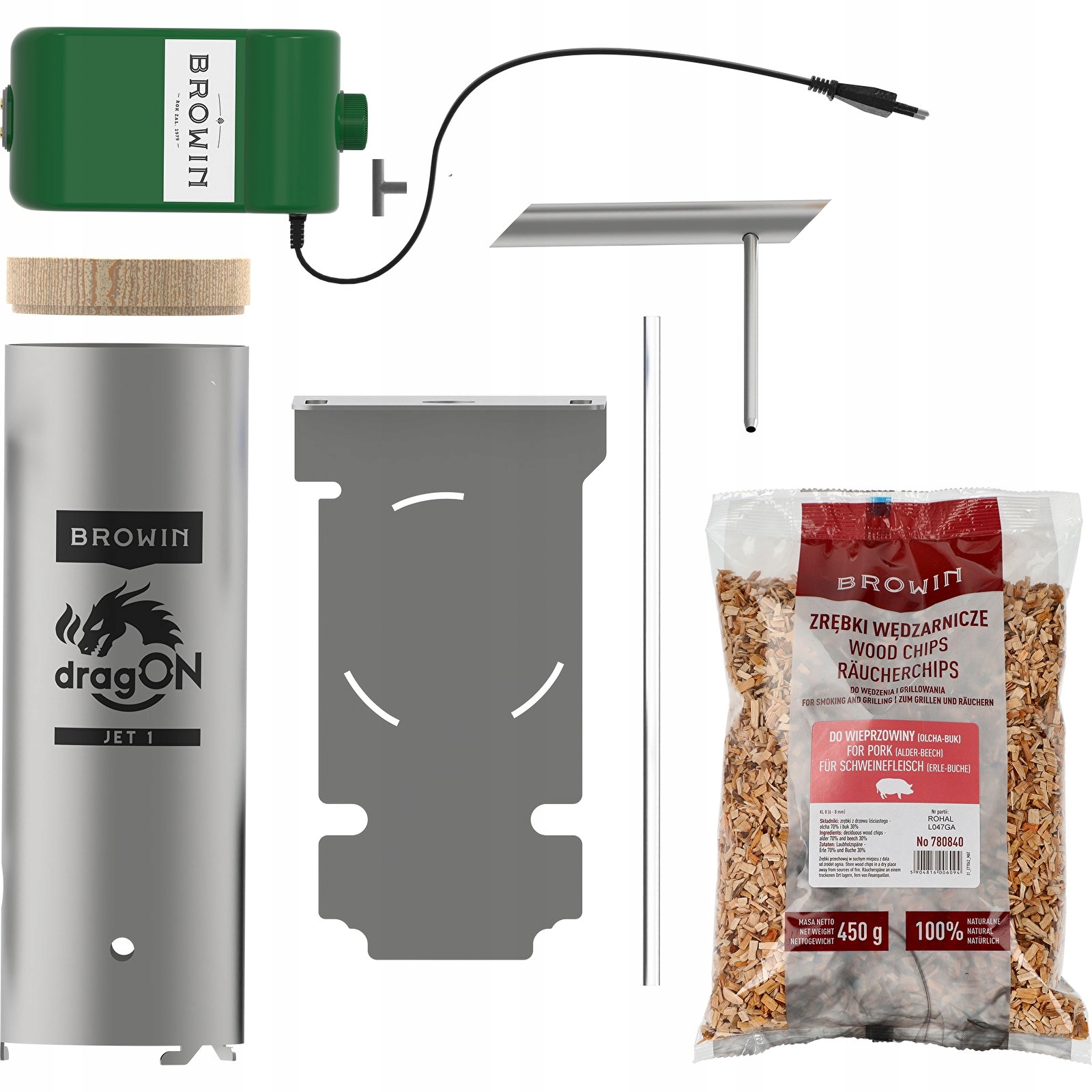 В предложении Browin имеется древесная щепа, предназначенная для данного вида продукта, которая идеально подходит для копчения мяса, рыбы или сыра.