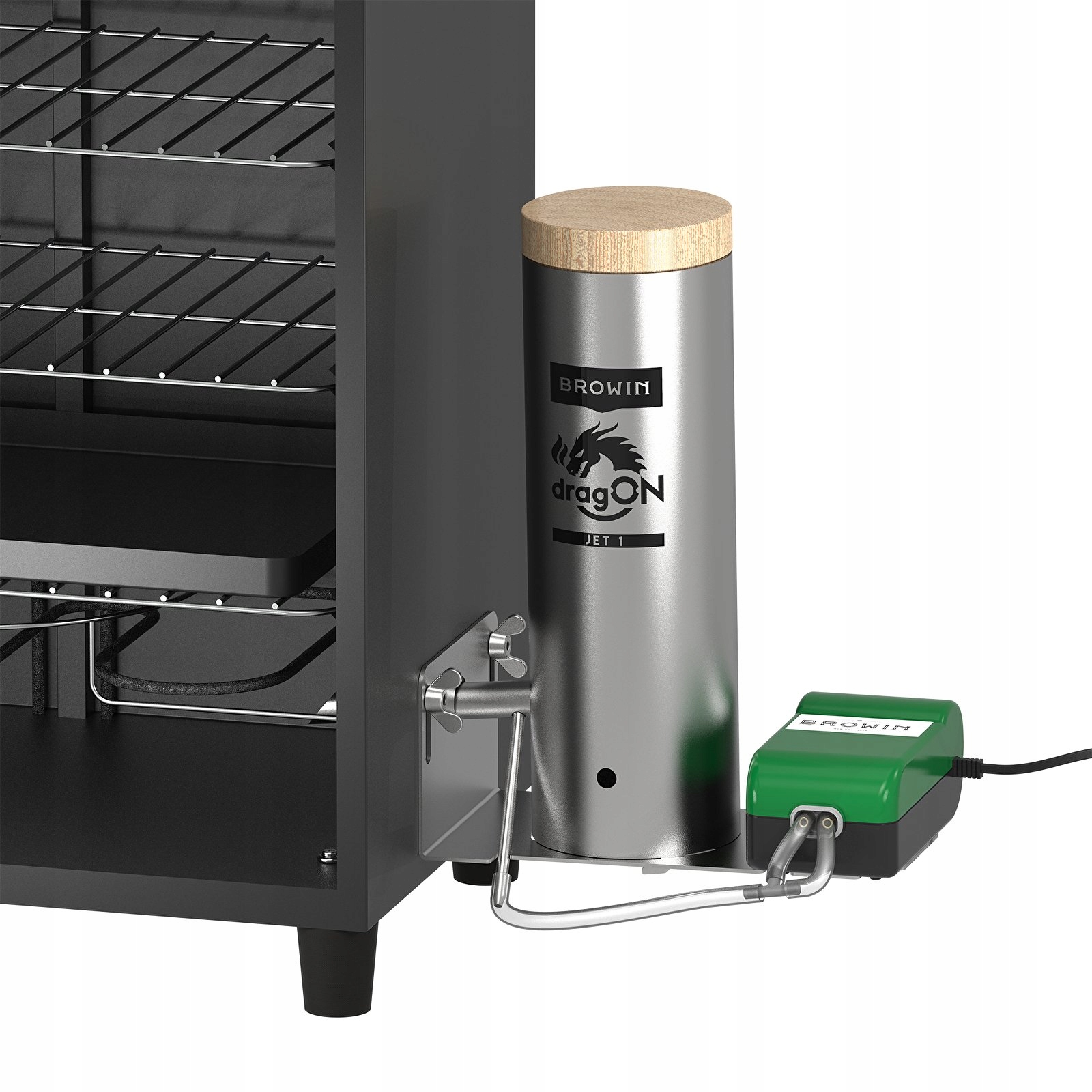 - Инновационный дымогенератор сопло - конструкция с соответствующим образом обрезанными концами, специальная угловая трубка и подключенный насос обеспечивают идеальное, равномерное поступление дыма в коптильню и высокую эффективность при низком расходе древесной щепы. Сопло вводится в коптильню под углом, что увеличивает поток дыма и помогает минимизировать скопление осадка, засоряющего типичные трубы при обжиге щепы. Насос для нагнетания воздуха подключается посредством шланга к угловой трубке, интегрированной с патрубком.