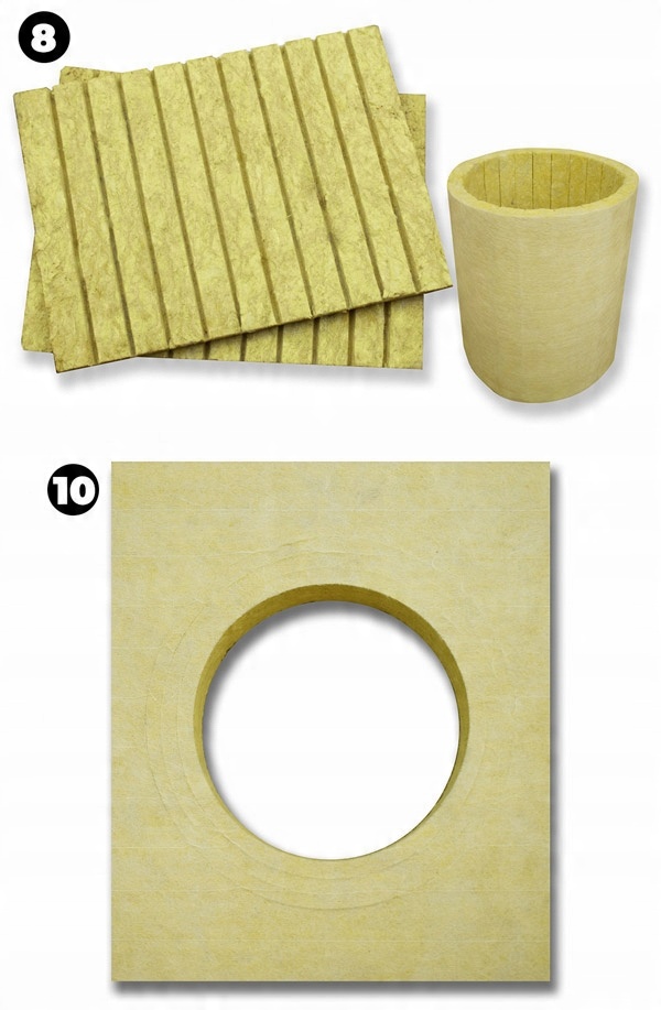 (10) ПЕРЕДНЯЯ ПАНЕЛЬ – изготовлена из негорючей гидрофобизированной минеральной ваты. Его задача – устранить напряжения, которые могут возникнуть в процессе эксплуатации дымохода. Также герметизирует отверстие в дымоходных блоках, где котел подсоединяется к дымоходу.