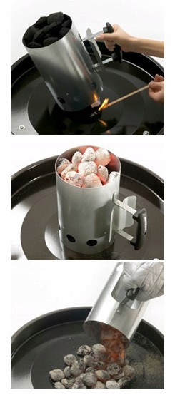 Применение: заполнить дымоход сверху брикетами. В нижнюю часть положите бумагу или растопку, подожгите и подождите, пока угли загорятся, затем высыпьте их в камин гриля/коптильни. Конструкцию следует устанавливать на негорючую, устойчивую, ровную поверхность вне помещения (например, на решетку гриля).