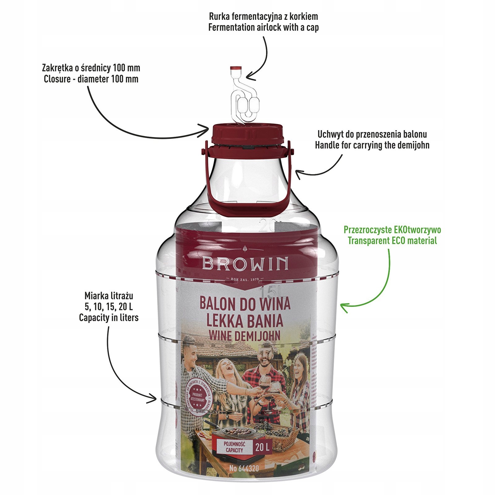 Небьющийся пластиковый баллон для вина и пива с завинчивающейся крышкой, трубкой для брожения и ручкой для переноски, 20 л - широкое отверстие, завинчивающаяся крышка, трубка для брожения, мерная шкала.