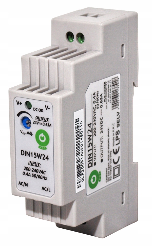 DIN15W12 — компактный источник питания постоянного напряжения мощностью 15 Вт, предназначенный для монтажа на DIN-рейку. Идеально подходит для питания систем промышленной автоматизации, светодиодного освещения и телекоммуникационных устройств.