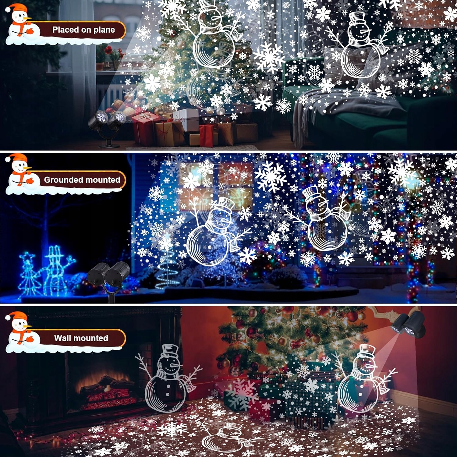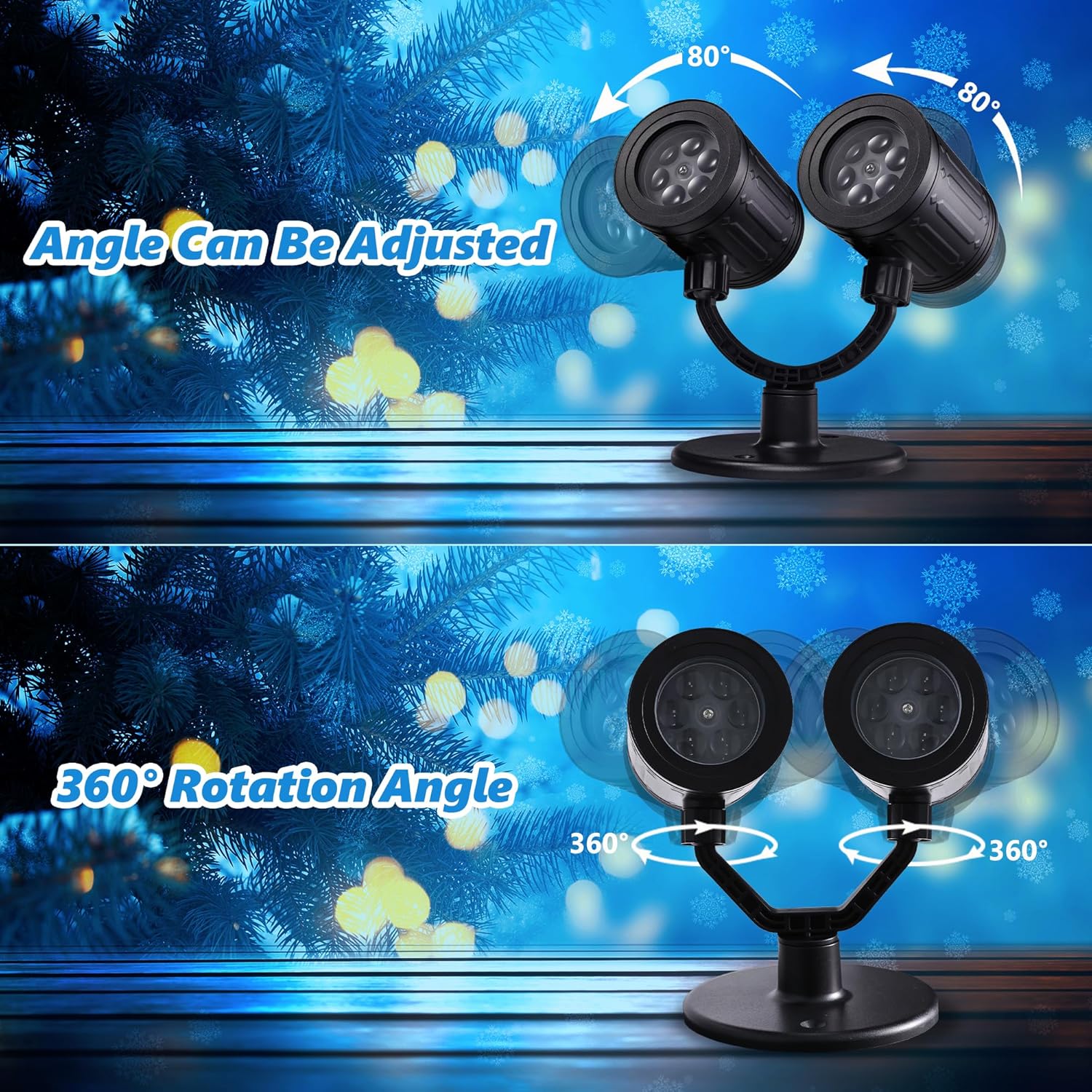 По сравнению с другими проекционными лампами, наш проектор для рождественских украшений имеет конструкцию с двойной головкой, что увеличивает проецируемую площадь. Каждую осветительную головку можно поворачивать на 360°. Для четкого и яркого слайд-шоу рекомендуемое расстояние составляет от 5 до 10 м. Проектор рождественских украшений водонепроницаем и может использоваться на открытом воздухе. (Совет: вилка не является водонепроницаемой, защищайте ее от воды)