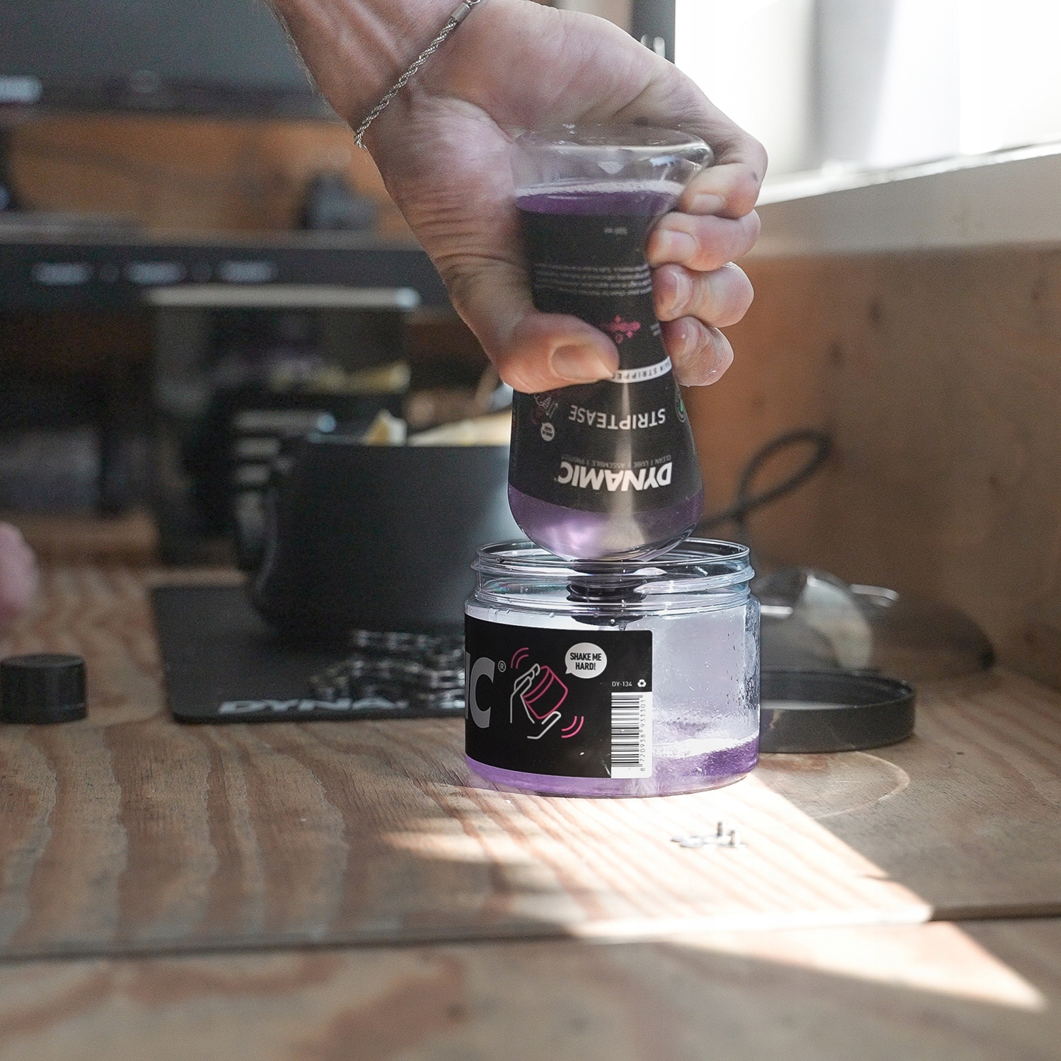 Dynamic Shake It Off — практичное и компактное решение для глубокой очистки велосипедной цепи перед нанесением воска. Созданный для работы со стриптизом, он позволяет быстро и эффективно удалить жир и грязь – без инструментов и без беспорядка. Просто вставьте цепочку, залейте жидкость, встряхните и все готово. Прочный контейнер отлично удерживает одну цепочку и обеспечивает необходимое количество чистящего средства. Это незаменимый элемент в аптечке каждого, кто пользуется (горячим) воском.