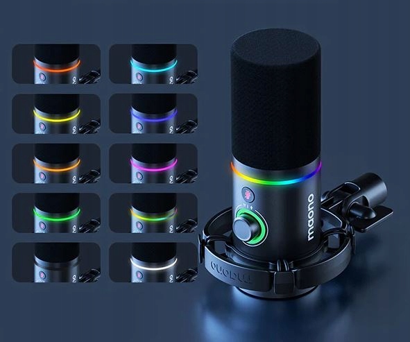 maoni pd200x оснащен rgb подсветкой с возможностью выбора из 8 цветов. Режим изменения цвета и возможность выключения подсветки позволяют адаптировать визуальный эффект к индивидуальным предпочтениям, добавляя современный вид в микрофон