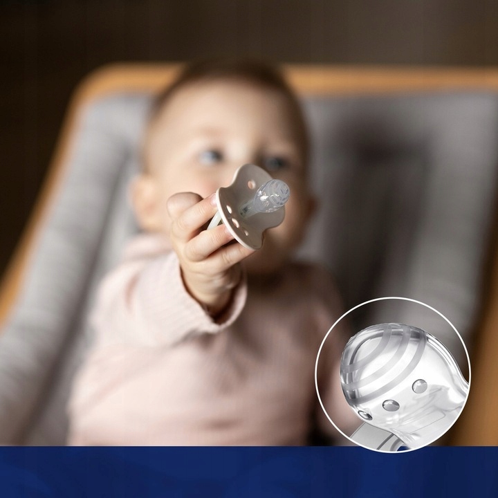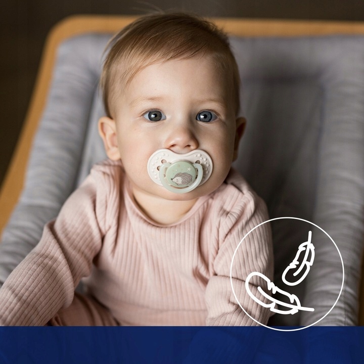 Соска Dynamic, благодаря уникальному силикону различной толщины, растягивается и сжимается в соответствии с ритмом сосания ребенка. Благодаря этому он защищает его сосательный рефлекс и не оказывает негативного влияния на грудное вскармливание. Ластик имеет симметричную форму, напоминающую форму соска, наполненного молоком, что дает ребенку привычное ощущение, похожее на ощущение груди.
