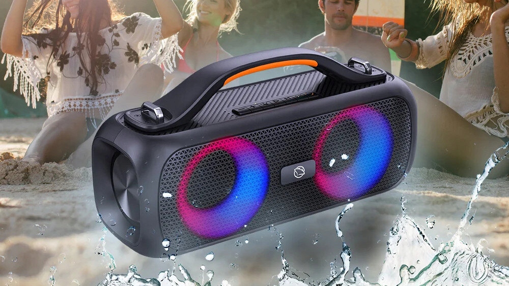 Брызгозащищенный Портативный Bluetooth-динамик Manta SPK216. Отличный звук с хорошо усиленными глубокими басами. Кроме того, встроенное радио, световые эффекты и голосовой помощник Siri и Google Assistant.