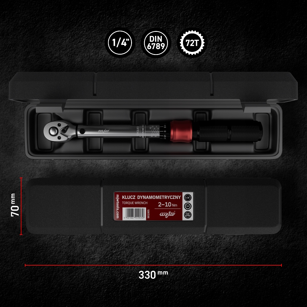 Динамометрический ключ MJW 1/4" 72T 2–10 Нм из хромованадиевой легированной стали для затяжки винтов с соответствующим крутящим моментом. Выбирая нашу продукцию, вы получаете: • динамометрический ключ • сертификат калибровки • руководство пользователя • пластиковый футляр для ключей