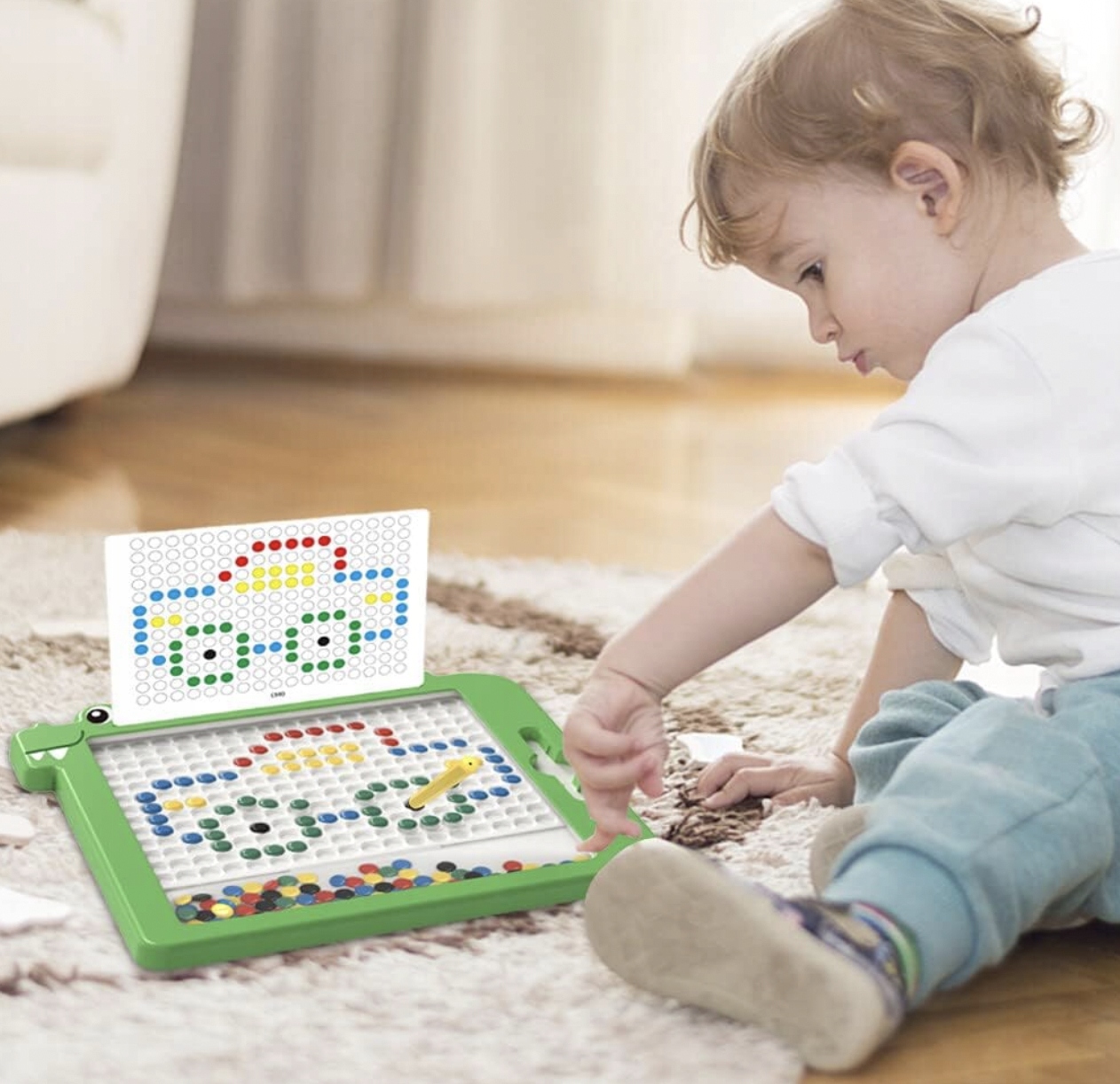 Игра с магнитной доской для рисования не только приятна, но и познавательна. Дети естественным образом узнают о принципах магнетизма, исследуя, как магнитный кончик ручки притягивает бусинки и как ими можно манипулировать. Такая форма обучения через игру развивает навыки логического мышления и поощряет самостоятельное открытие различных явлений. .